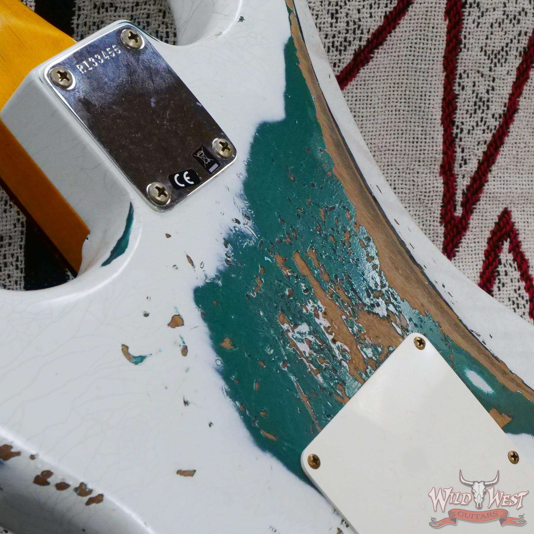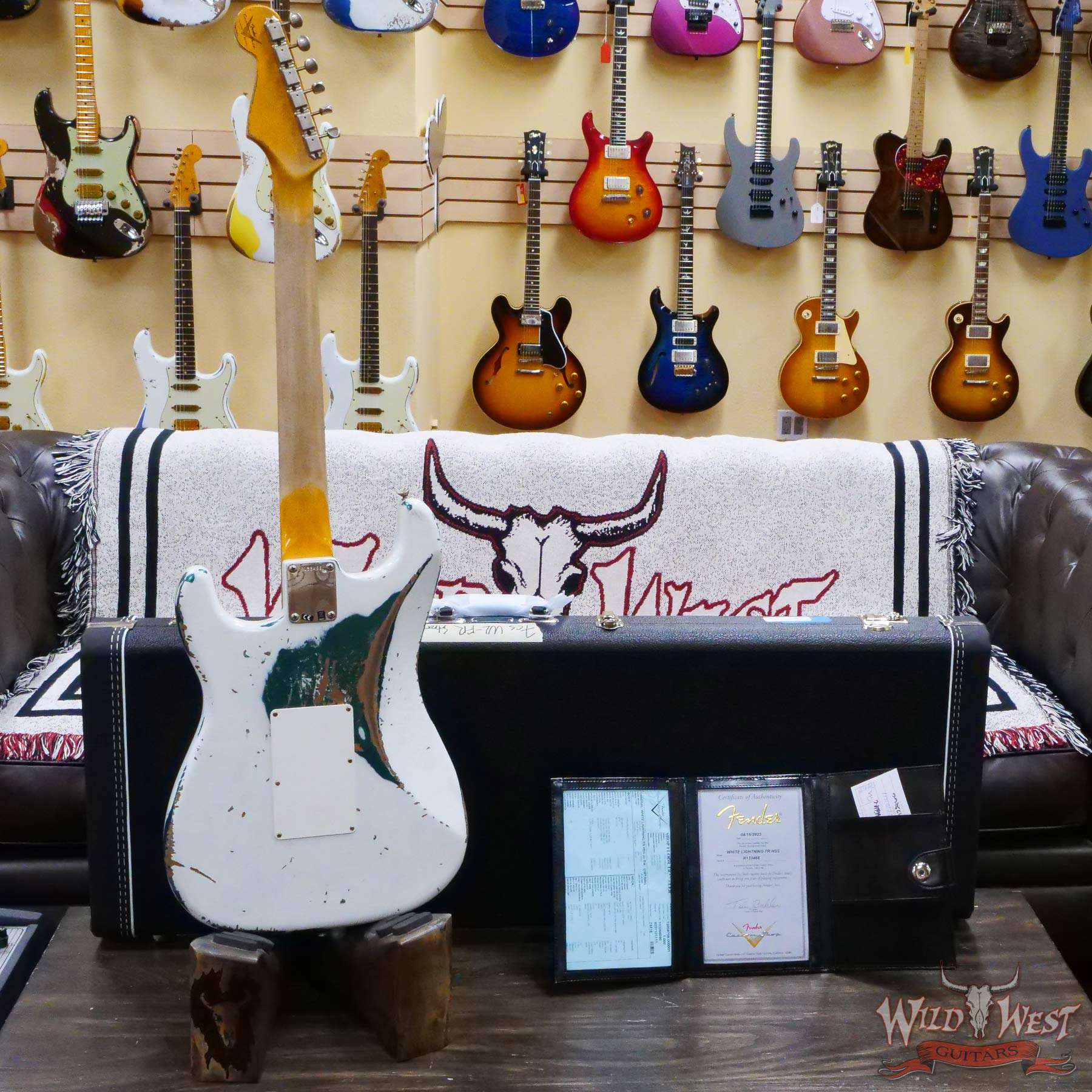 White Lightning(Black Lightning) Strikes The Dusty Plains of The Wild West! White Lightning rips all day n’ rocks all night with traditional Fender tremolo system firepower. The molten Wild West Fender Custom Shop Exclusive Heavy Relic Dirty Neck monster rules the rock n’ roll wastelands, packing a pair of Fat 50s relic single coils and a killer DiMarzio Tone Zone humbucker in the bridge position.
