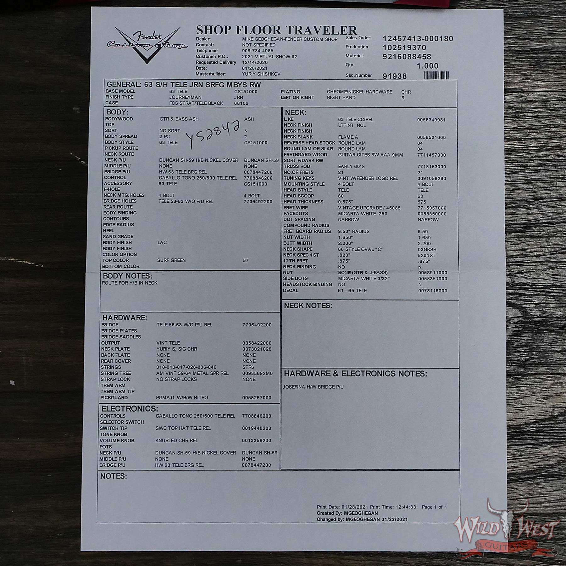 Fender Custom Shop Yuriy Shishkov Masterbuilt 1963 Telecaster HS Josefina Hand-Wound Pickup Journeyman Relic Surf Green