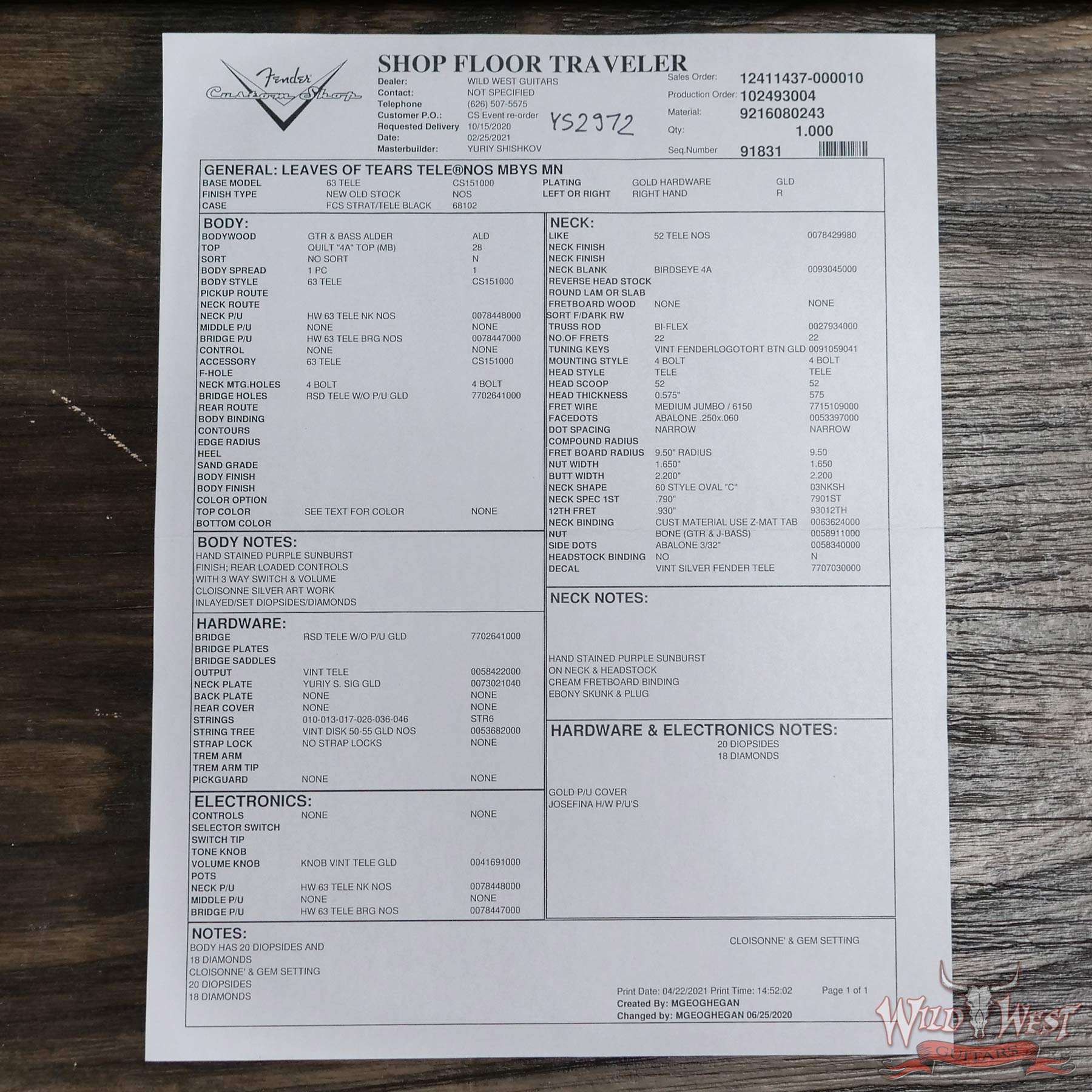 Fender Custom Shop Yuriy Shishkov Masterbuilt Prestige Leaves of Tears Telecaster NOS Josefina Hand-Wound Pickups Purple Sunburst