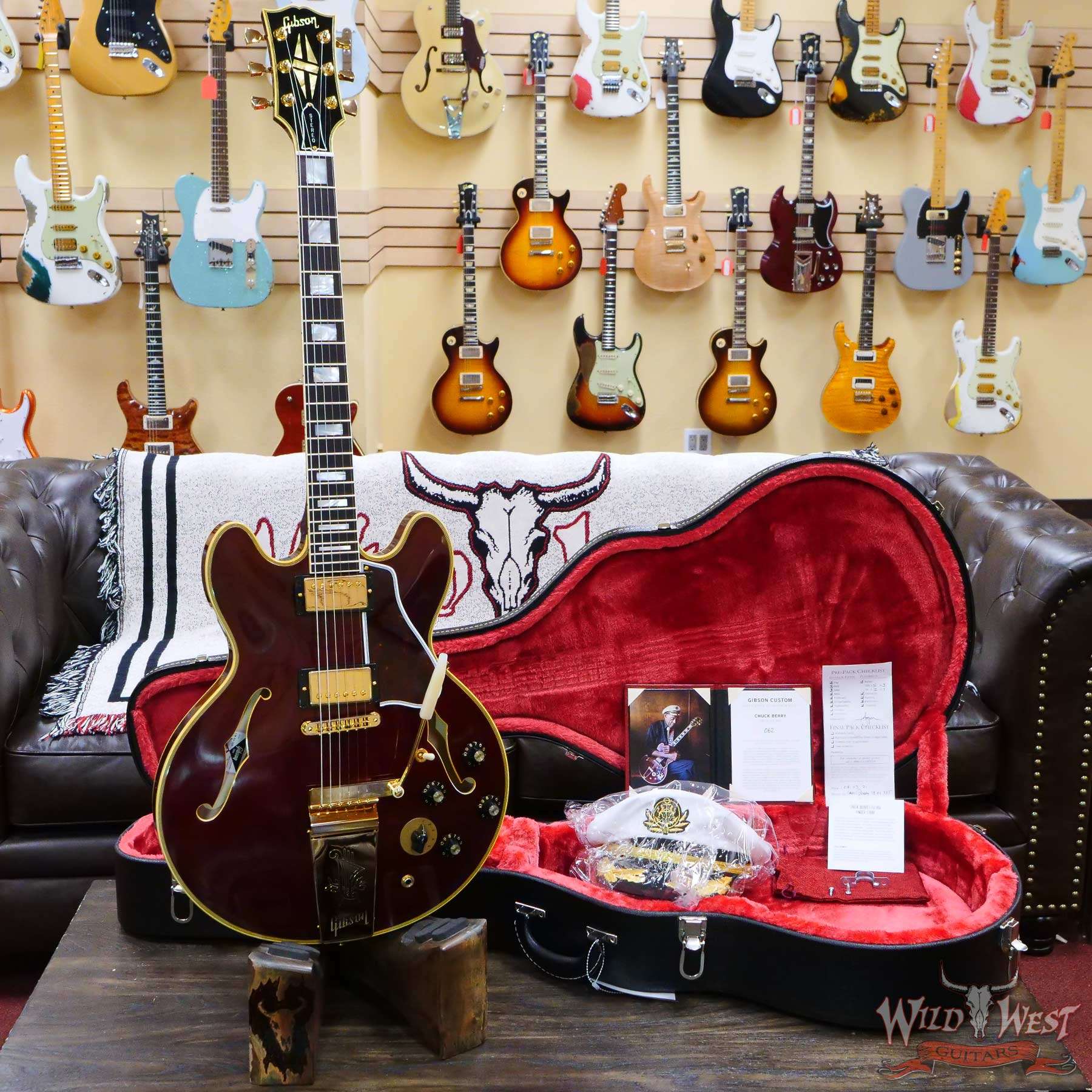 To honor Chuck Berry’s legacy, we made sure every aspect of construction and appointments is historically correct, including aged gold hardware, a Maestro™ Vibrola™, Grover® tuners, a Varitone switch, and a classic Split Diamond headstock inlay. The Wine Red finish features Murphy Lab custom aging, giving it the look and feel of the original. Case candy includes a captain’s hat, conduit bracket/finger holder (with instructions), and a certificate of authenticity. Only 100 guitars will be hand-made by the expert luthiers and craftspeople of the Gibson Custom Shop as part of this very special limited run.