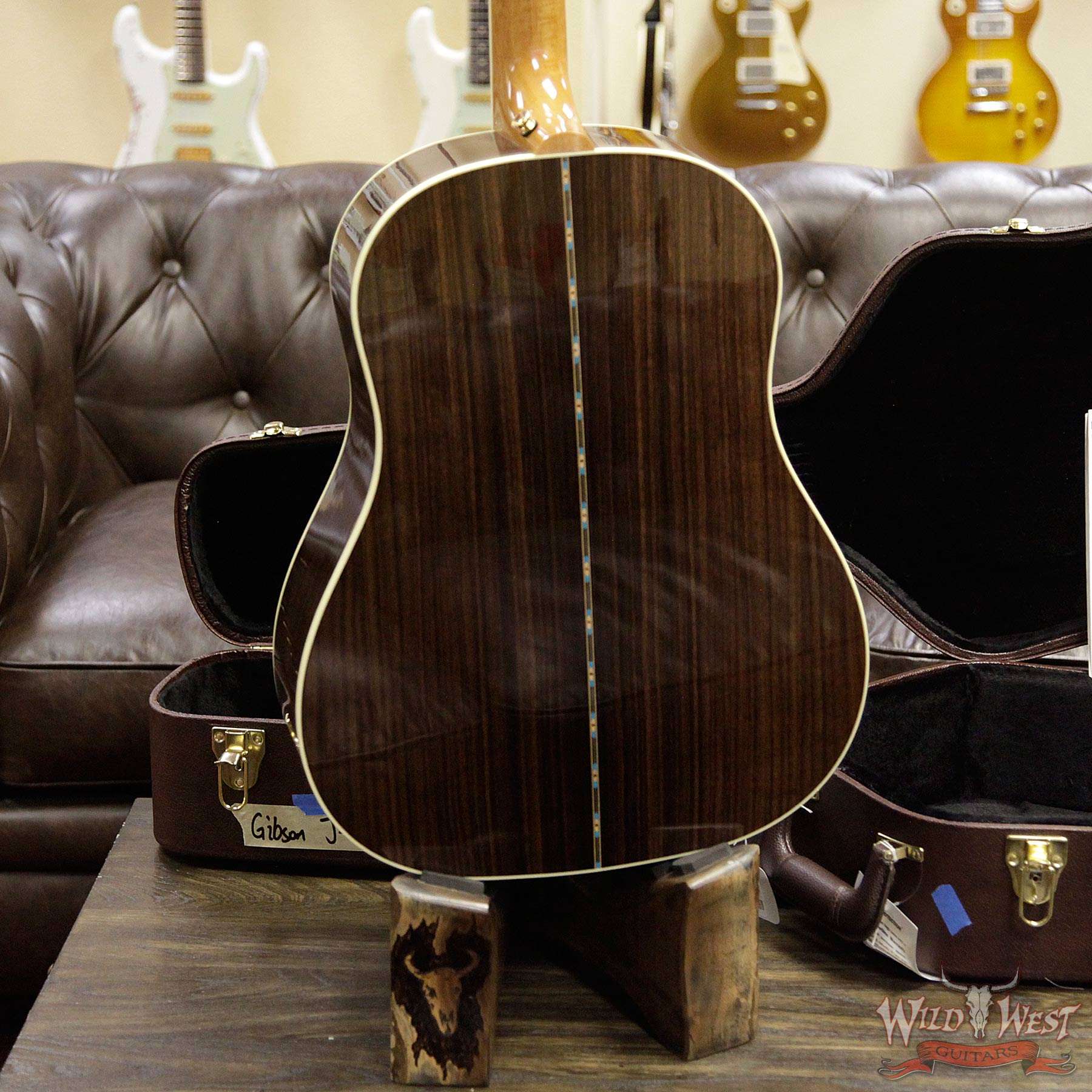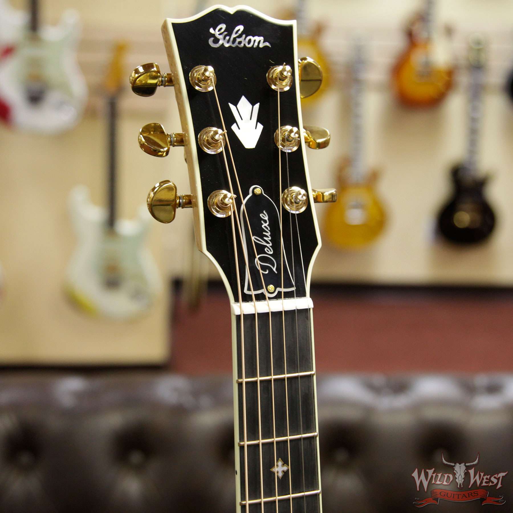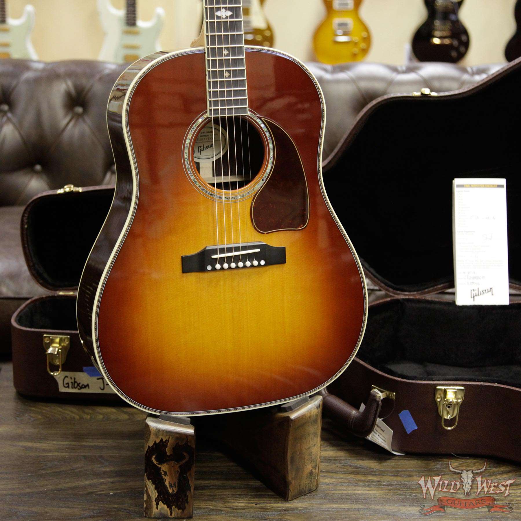Built upon the famous J-45 platform this J-45 Deluxe offers custom features throughout. Beautiful multi-ply top trim with added multi-colored rope binding, rosewood back and sides, Mother-of-pearl split diamond inlay, hand sprayed Rosewood Burst finish, and bound peghead. Finished with an LR Baggsâ„¢ VTC pickup.