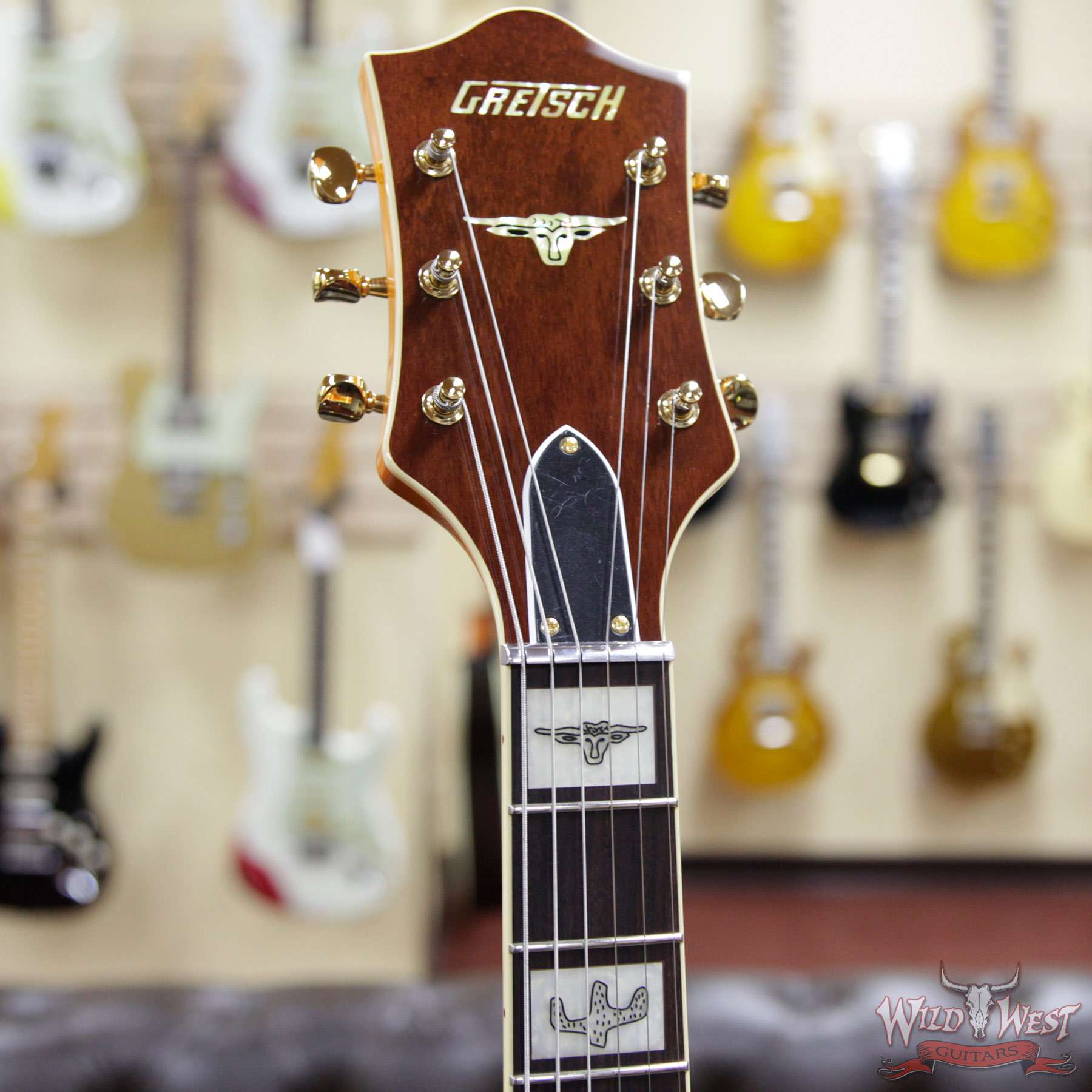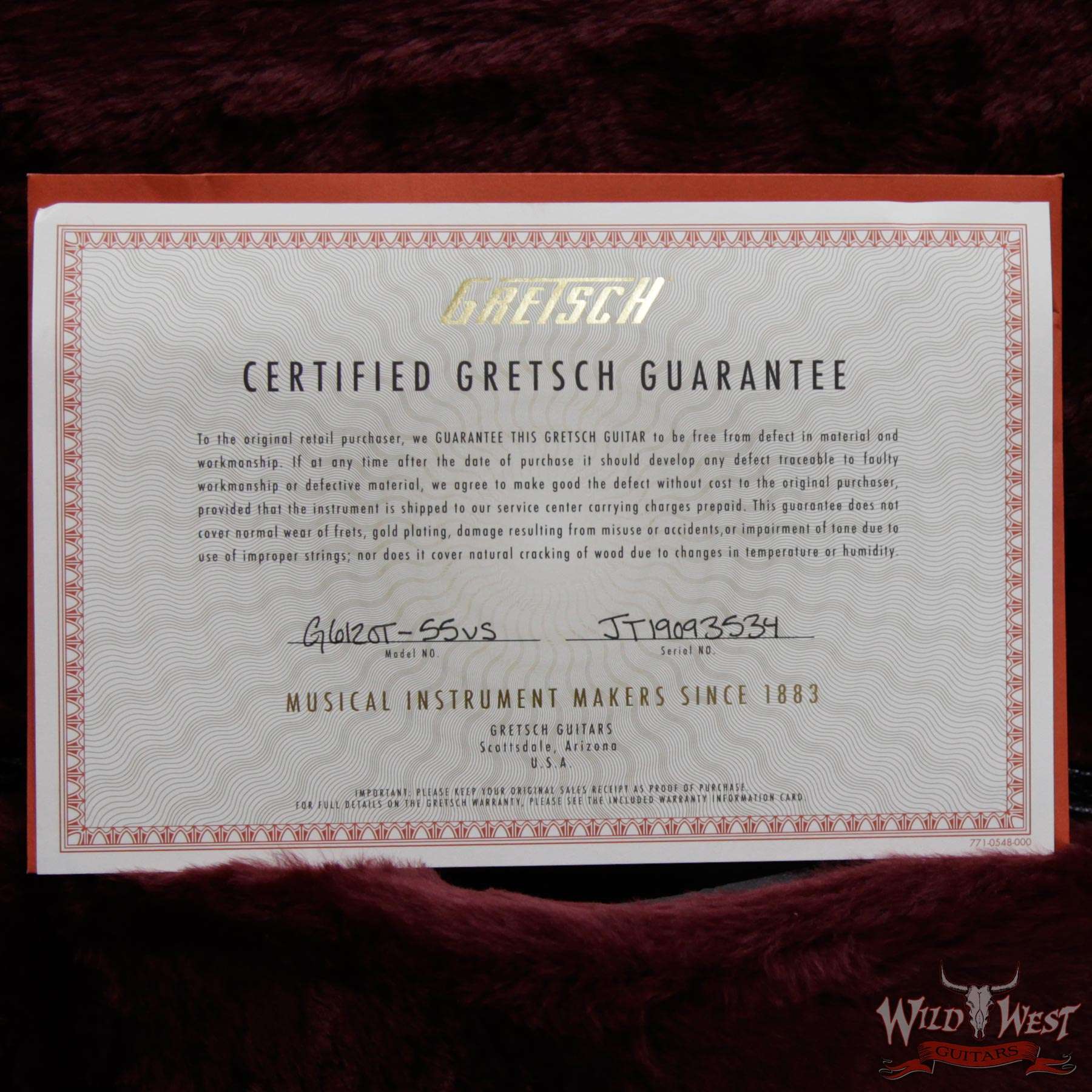Designed for pure tone and slick, comfortable playing feel, this guitar features the classic appointments Gretsch fans desire—gold G-arrow control knobs, aged white binding with black purfling, durable gloss nitrocellulose lacquer finish, aged pearloid block inlays with classic Western motif, gold vintage thick plexi pickguard with Gretsch logo and gold Grover® Sta-Tite™ tuning machines. A resurrected blast from the past with elegantly refined style and sound, the G6120T-55 Vintage Select Edition ‘55 Chet Atkins® Hollow Body with Bigsby® is sure to satisfy any devotee of Gretsch’s golden era.