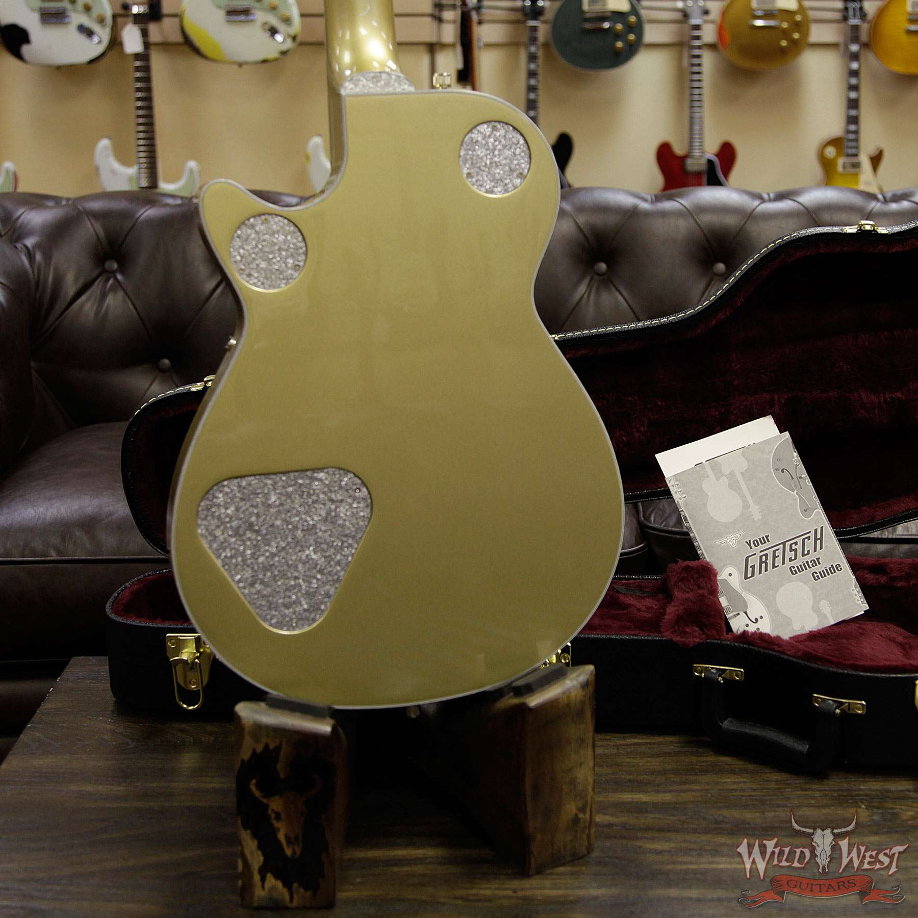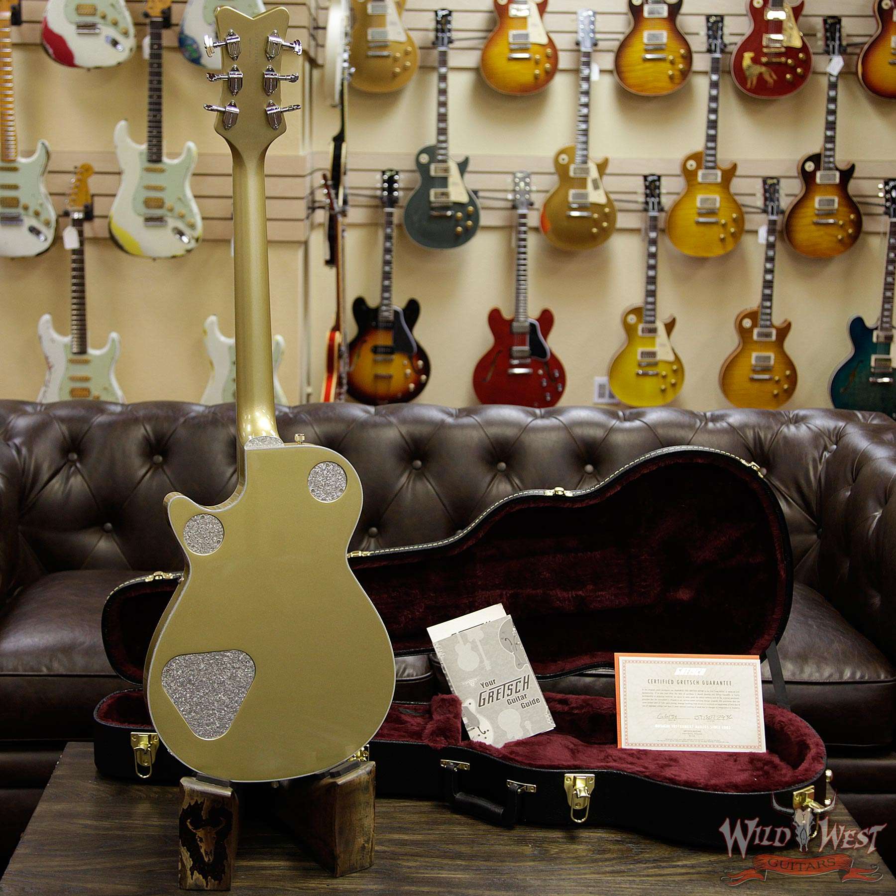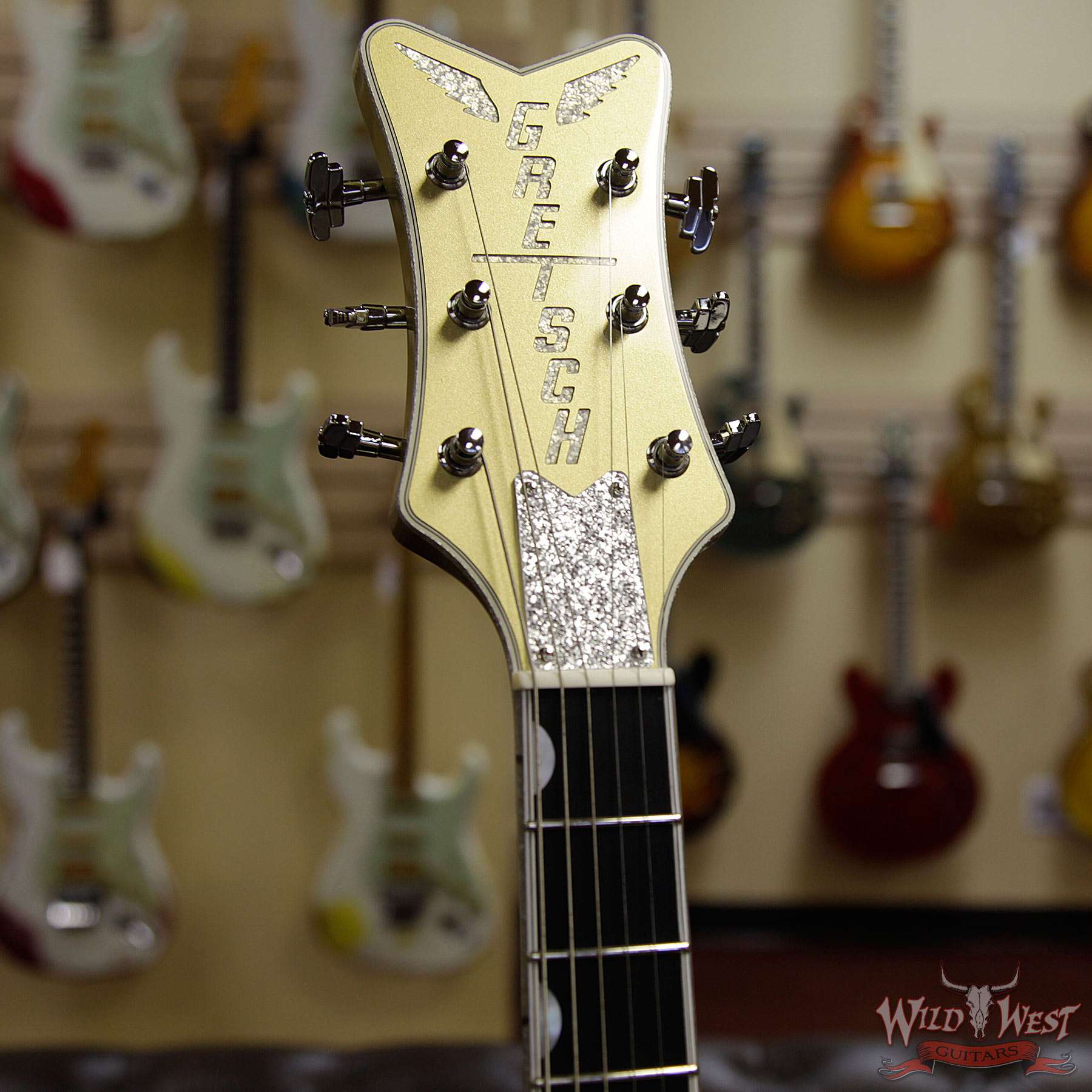The richly appointed G6134T Limited Edition Penguin™ with Bigsby® takes Gretsch’s rarest bird and decks it out in a flashy Casino Gold finish, complemented by a matching headstock, glittering silver sparkle binding with white/black/white purfling and chrome hardware (including a banjo arm rest).