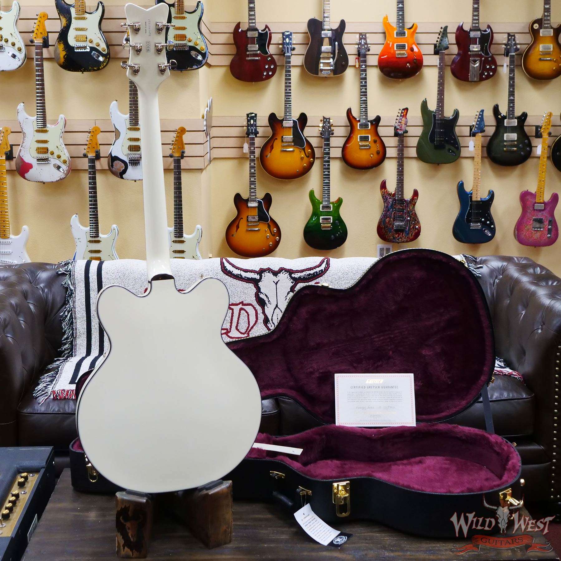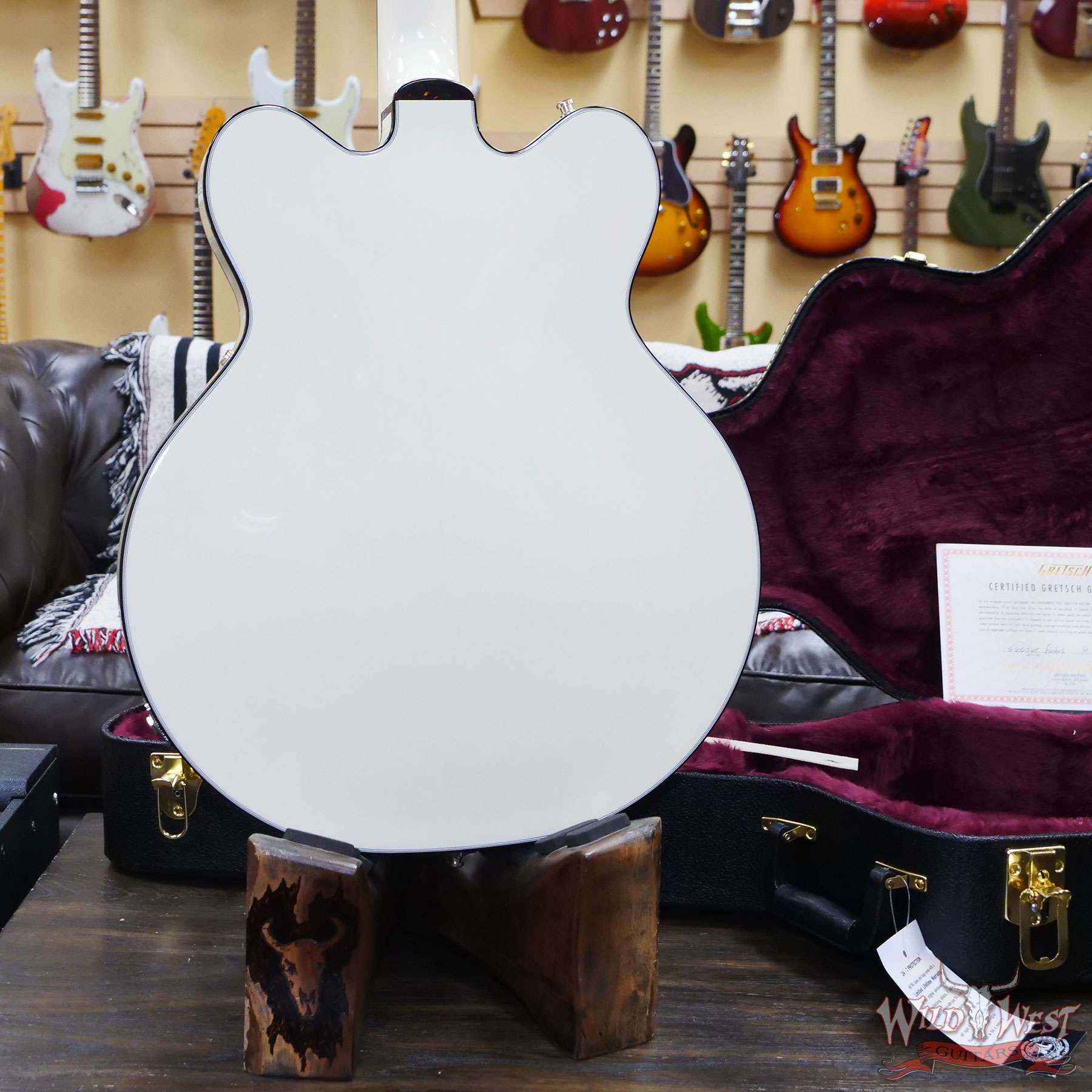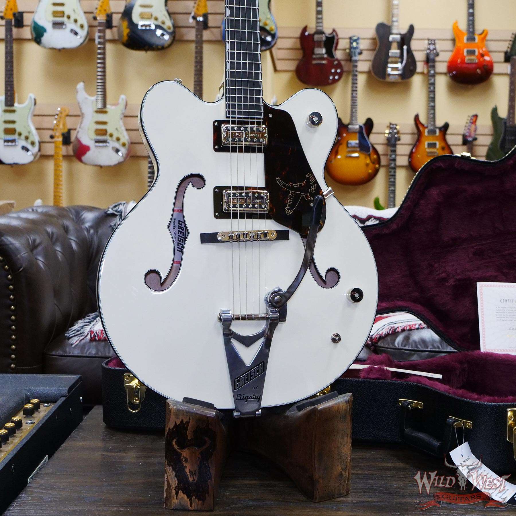 A player-centric instrument ready to rock any genre, the G6636T-RF Richard Fortus Signature Falcon Center Block with String-Thru Bigsby comes in a stunning Vintage White finish and is decked out with nickel hardware including the jeweled G-arrow knobs, pearloid Neo-Classic™ thumbnail inlays and tortoise headstock logo, binding, bezels and pickguard.