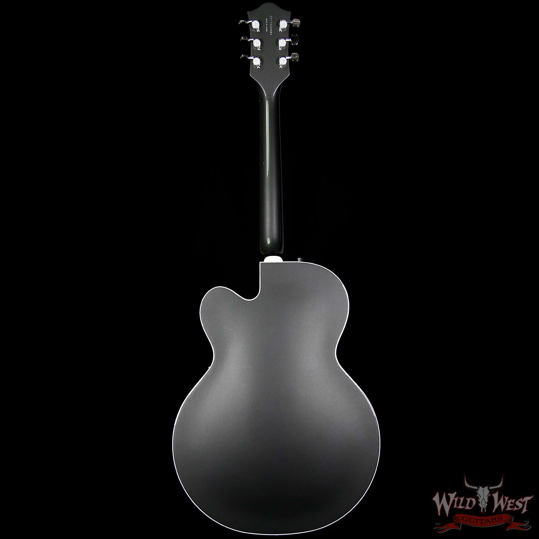A pair of High Sensitive Filter’Tron™ humbucking pickups responds to every note dynamically—snarling or purring according to how hard you strike the strings. The control complement—separate bridge and neck volume controls, three-way pickup switching, No-Load master tone and also a master volume—allows for near-infinite tonal variations. The all-new Gretsch “Squeezebox” paper-in-oil caps add smooth vintage tone while the treble bleed circuit lets your guitar retain all of its tasty clarity when rolling the volume control down. The standard “U”-shaped maple neck bears a 12”-radius rosewood fingerboard with 21 durable medium jumbo frets for a memorable playing experience that works with any fret-hand style. A pinned “rocking” bar bridge reacts in concert with the Bigsby B6CP vibrato tailpiece for stable tuning while the teflon-impregnated GraphTech® Tusq XL nut lets the strings slide freely, without binding in the slots. A thinner, 2.25” body provides maximum comfort during long sets while the innovative Gretsch “ML” bracing allows the guitar to retain that rich, full hollow body sound. In a uniquely Gretsch touch, the Bigsby tailpiece is now string-through, making it quicker (and easier) to change strings as well as providing increased vibration transfer for enhanced sustain.