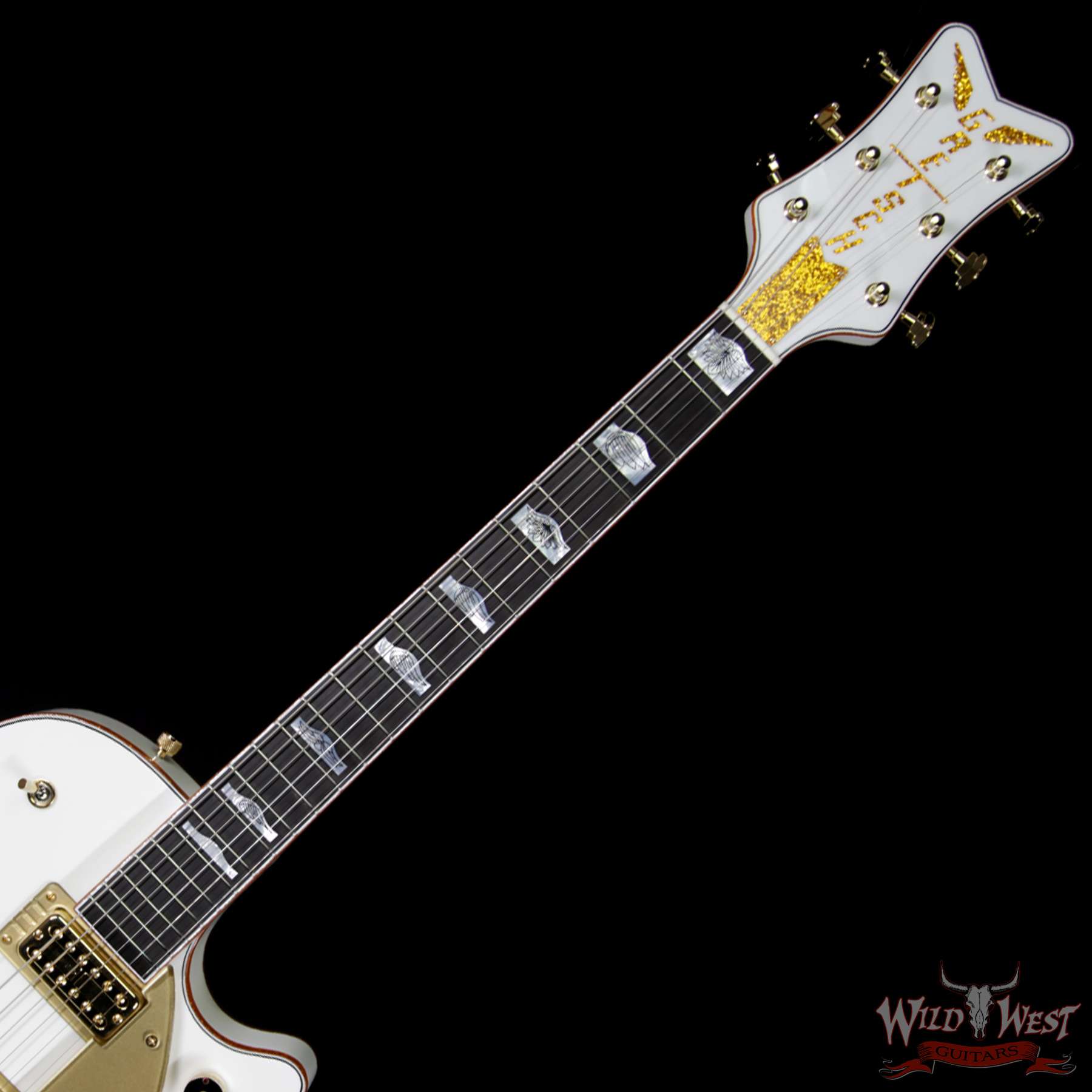 A veritable holy grail among classic electric guitar aficionados, the Gretsch® White Penguin™ combines the gold and glitter of the Falcon™ with the sleek style of the Duo Jet™. Features include single-cutaway chambered body with arched top and gold-sparkle binding, one-piece mahogany neck, gold-sparkle-bound ebony fingerboard with feather-motif hump-block inlays, gold-sparkle-bound headstock with inlaid winged Gretsch logo and gold-sparkle truss rod cover, TV Jones® Classic pickups, three-position pickup switch, gold plexi pickguard with Penguin motif, rhinestone and white dot control knob inlays, Synchro-Sonic™ bridge, Gretsch “G” Cadillac® tailpiece, gold-plated Grover® Imperial™ tuners, banjo armrest and gold-plated hardware.