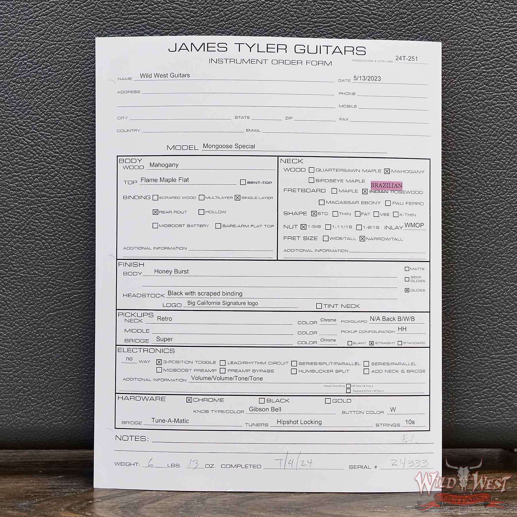 James Tyler USA Mongoose Special Flame Maple Top Brazilian Rosewood Fingerboard Honey Burst 6.80 LBS (US Only / No International Shipping)