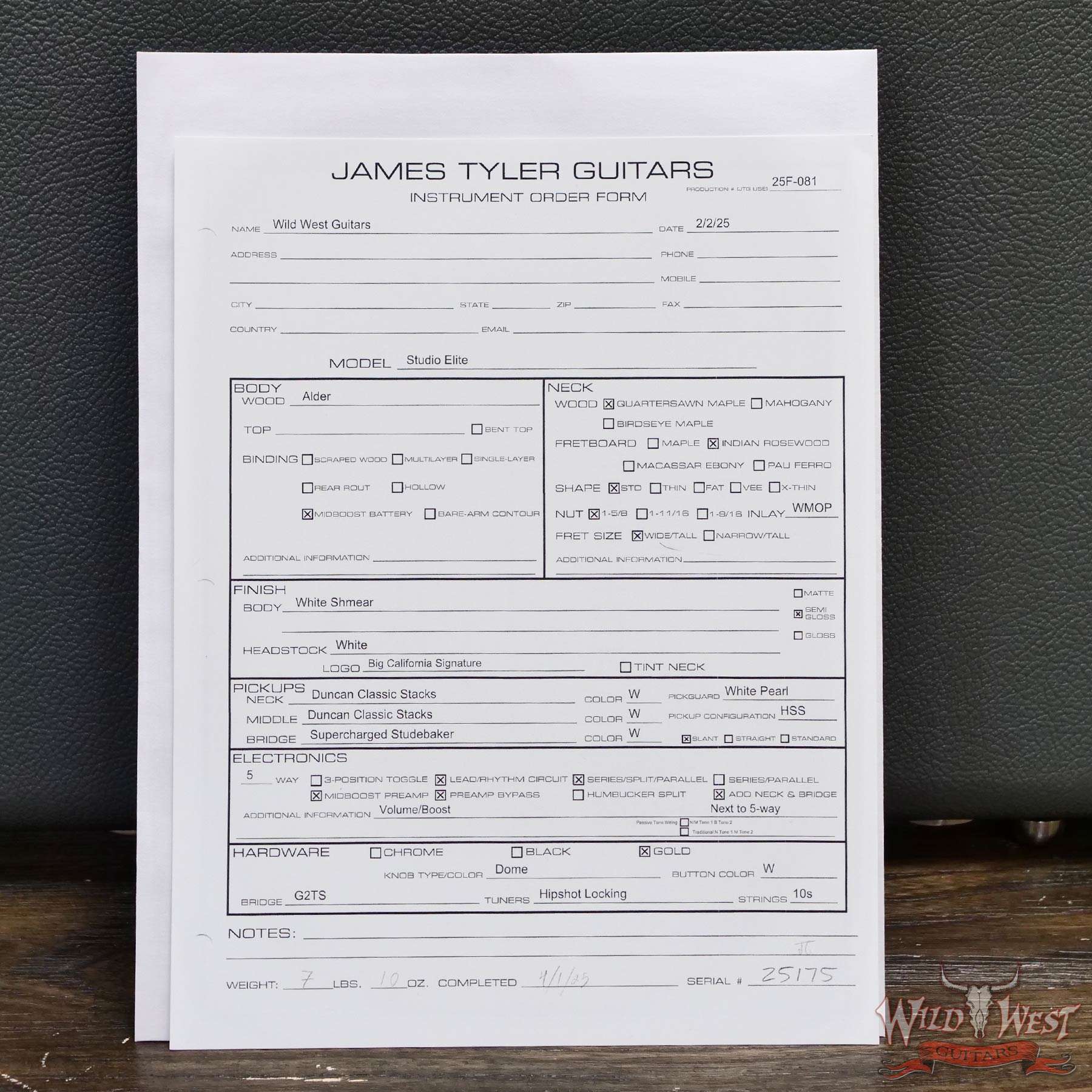 James Tyler USA Studio Elite Alder Body Indian Rosewood Fingerboard White Shmear with Gold Hardware 7.65 LBS