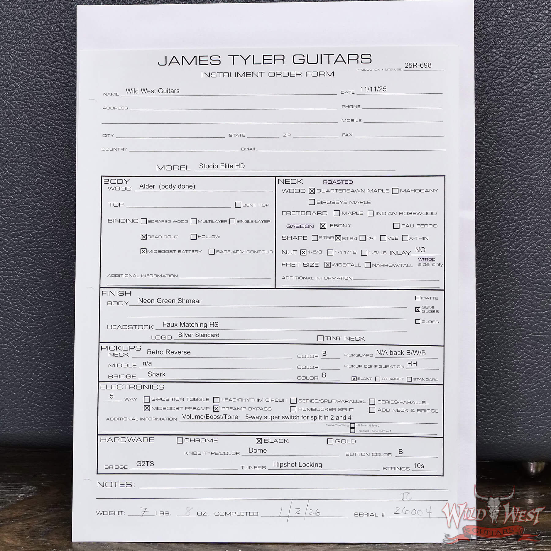 2026 James Tyler USA Studio Elite HD HH Roasted Maple ’64 Neck Neon Green Shmear(New Color) 7.45 lbs