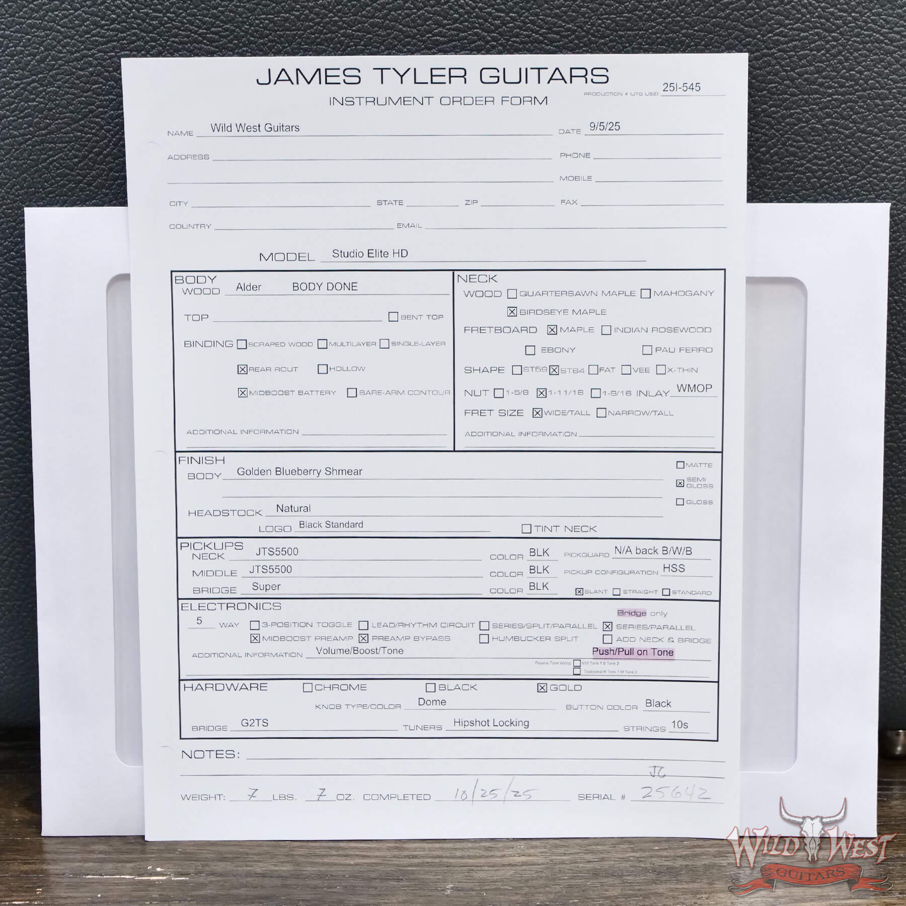 James Tyler USA Studio Elite HD HSS Birdseye Maple Standard ’64 Neck Golden Blueberry Shmear 7.45 lbs