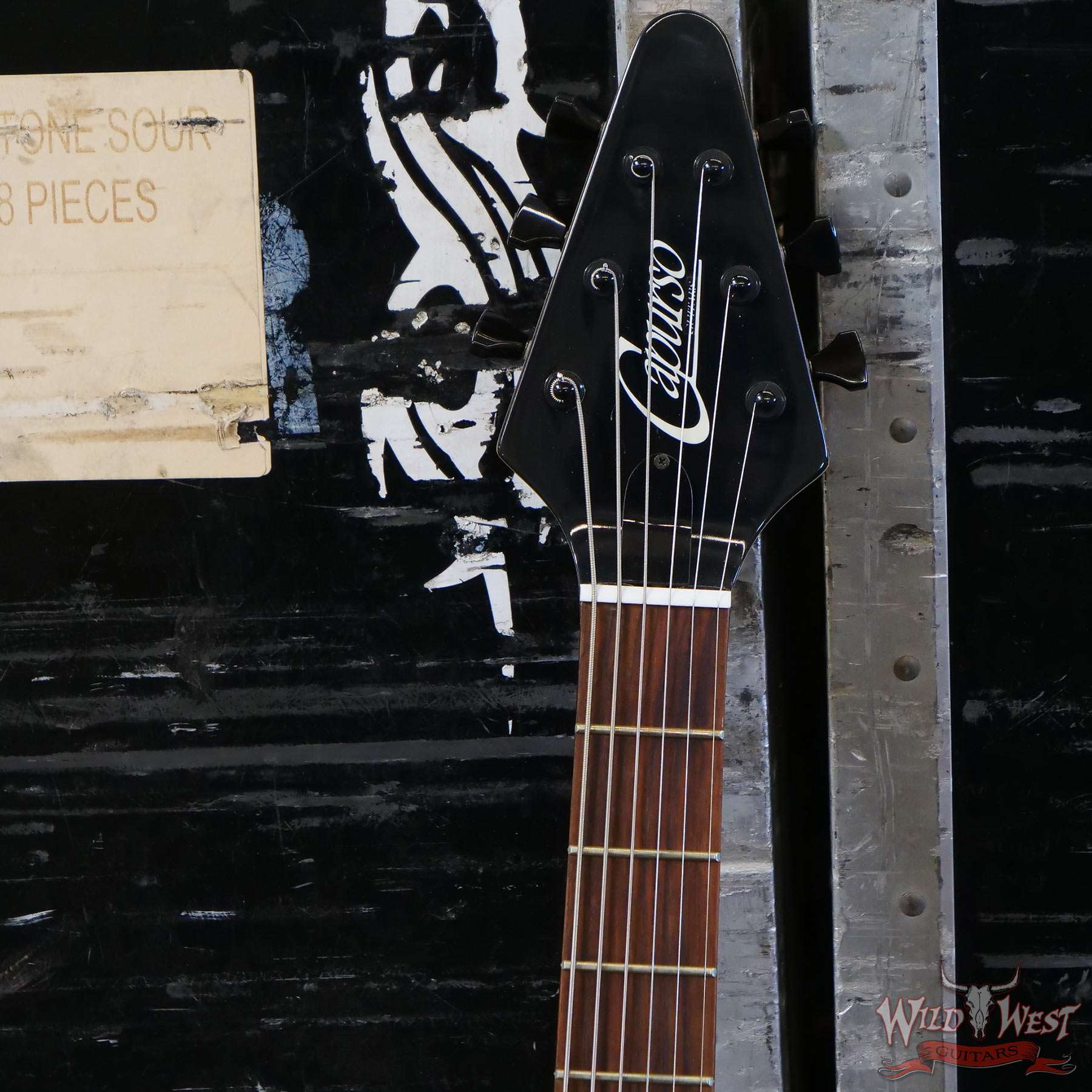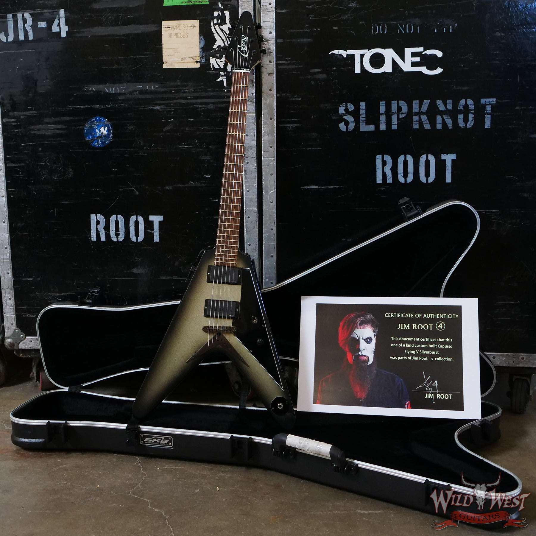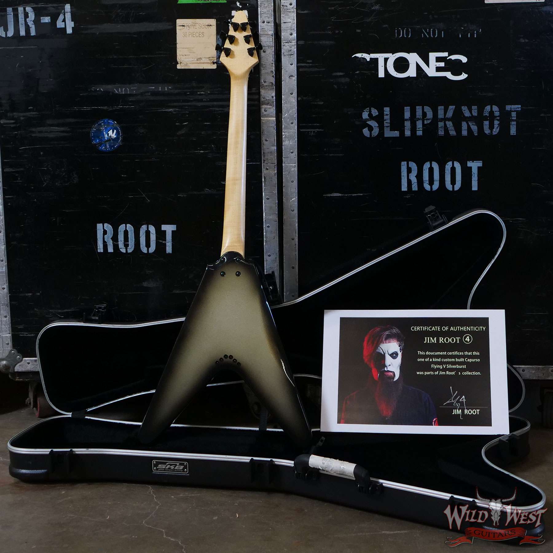 This One Of A Kind Custom Built Capurso Flying V in Silverburst finish was parts of Jim Root’s Collection.