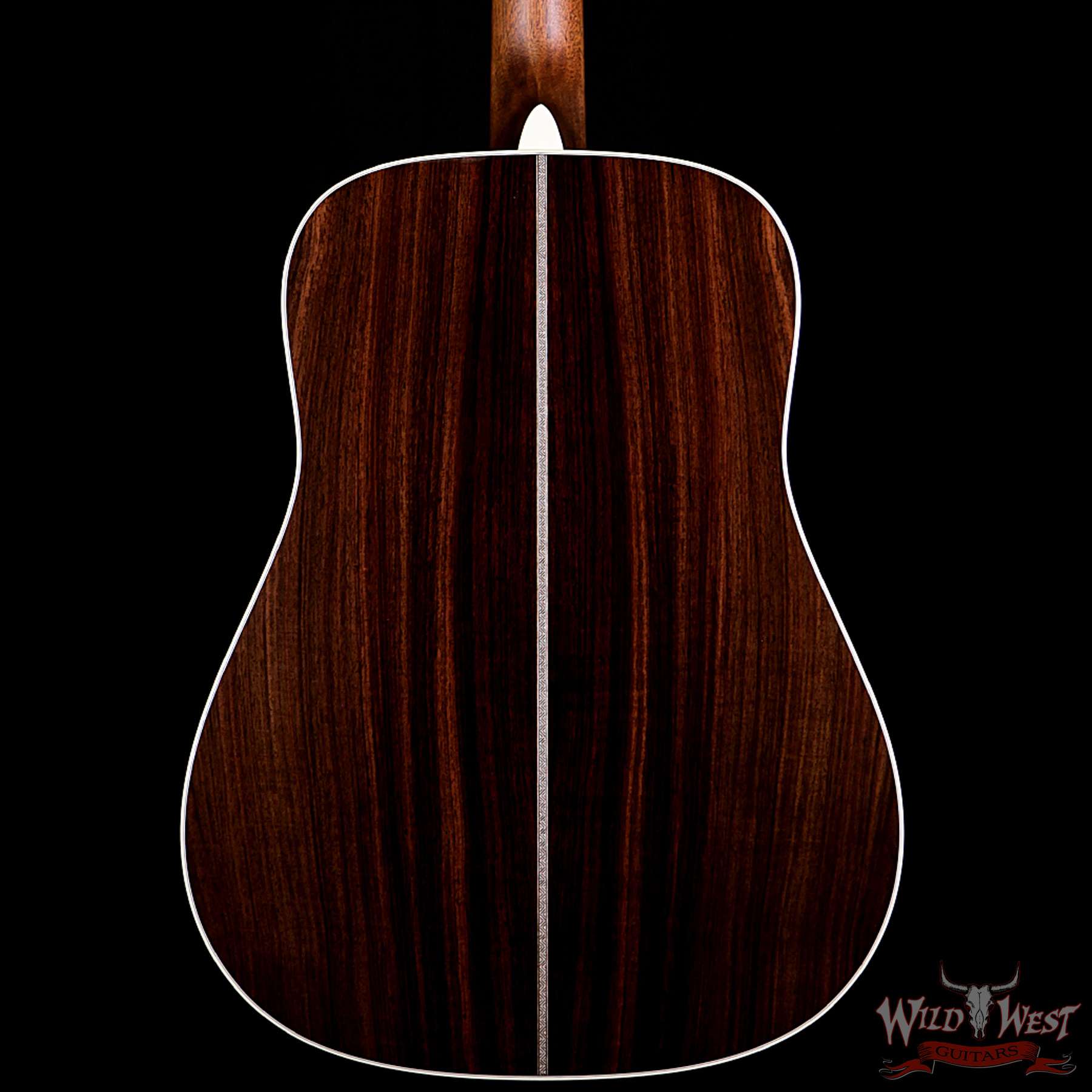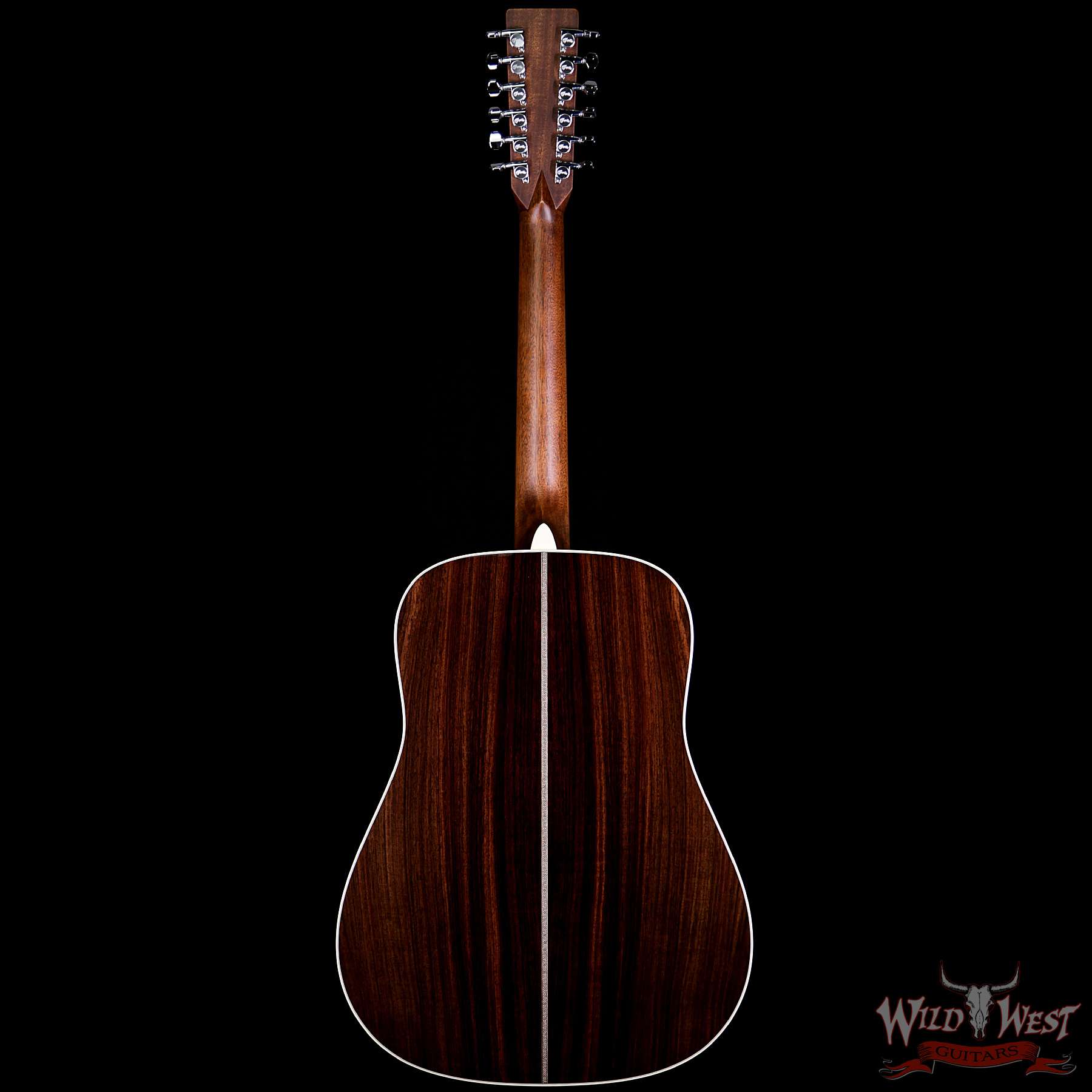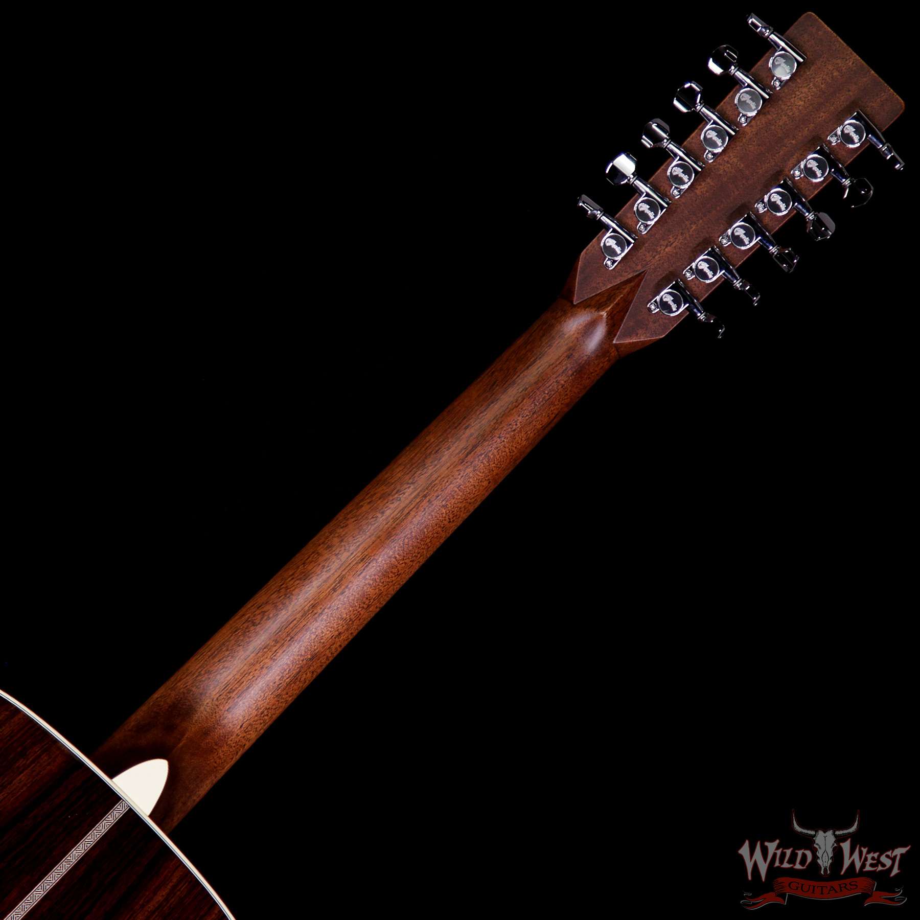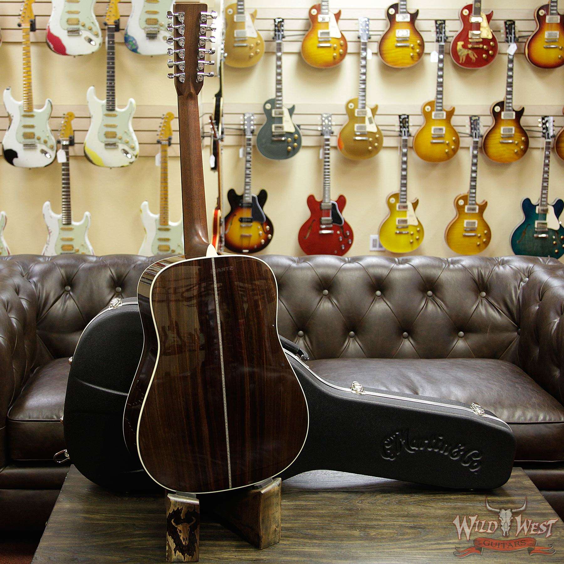 The Martin D12-28 12-String Dreadnought Guitar has a solid Sitka spruce top, solid East Indian rosewood back and sides, black ebony fingerboard on a solid mahogany neck, solid ebony bridge, and a solid rosewood headplate with raised gold foil logo.