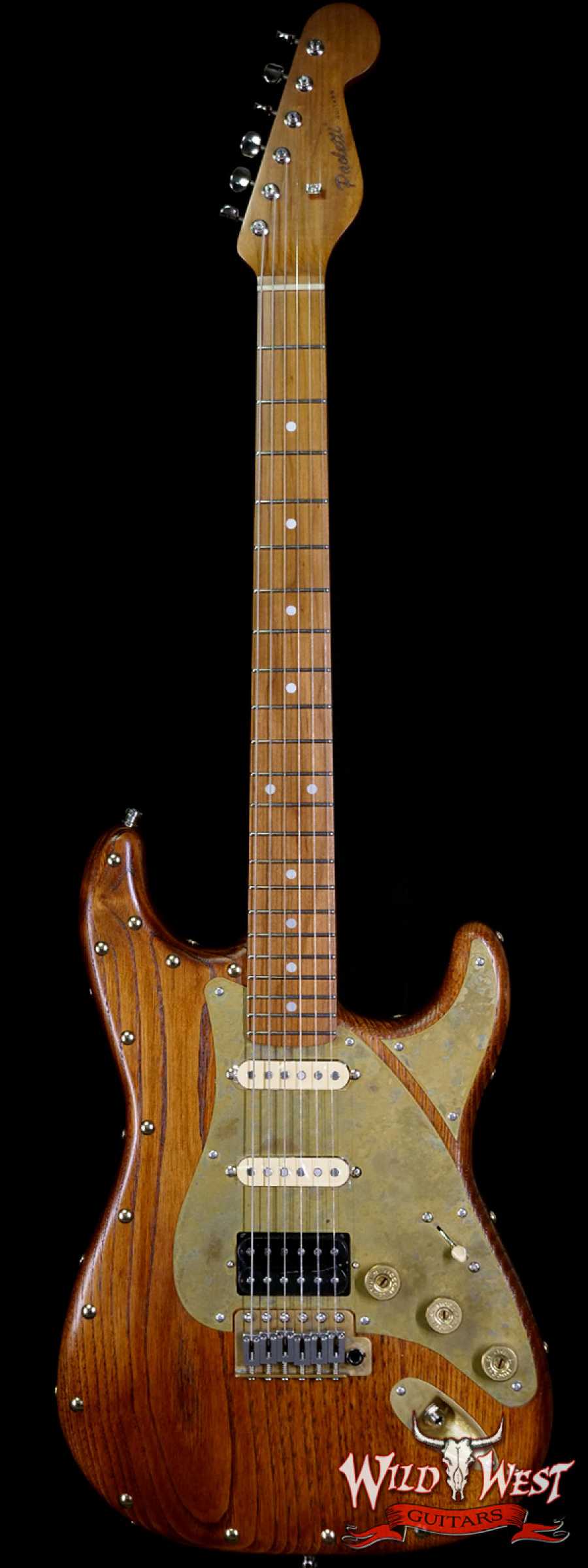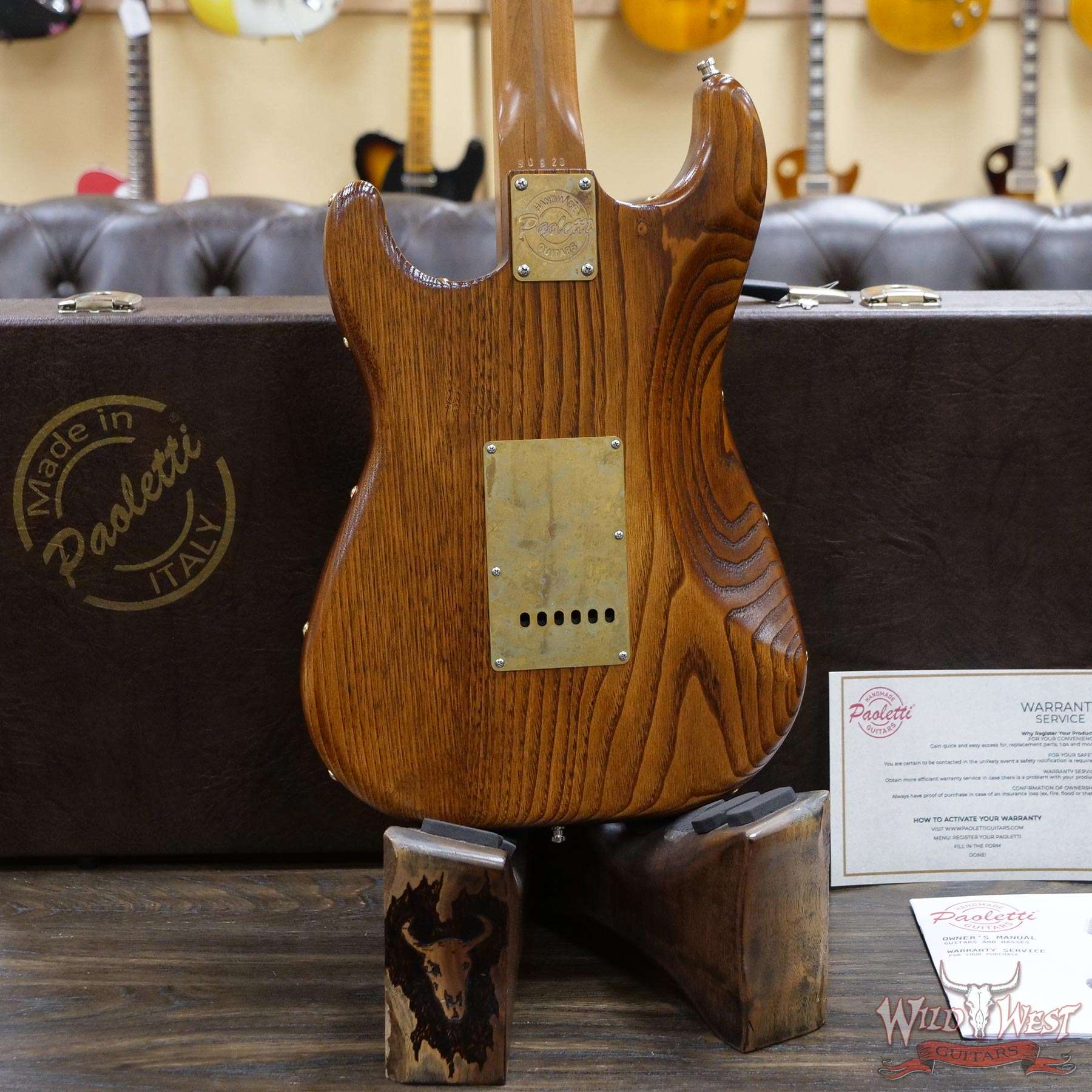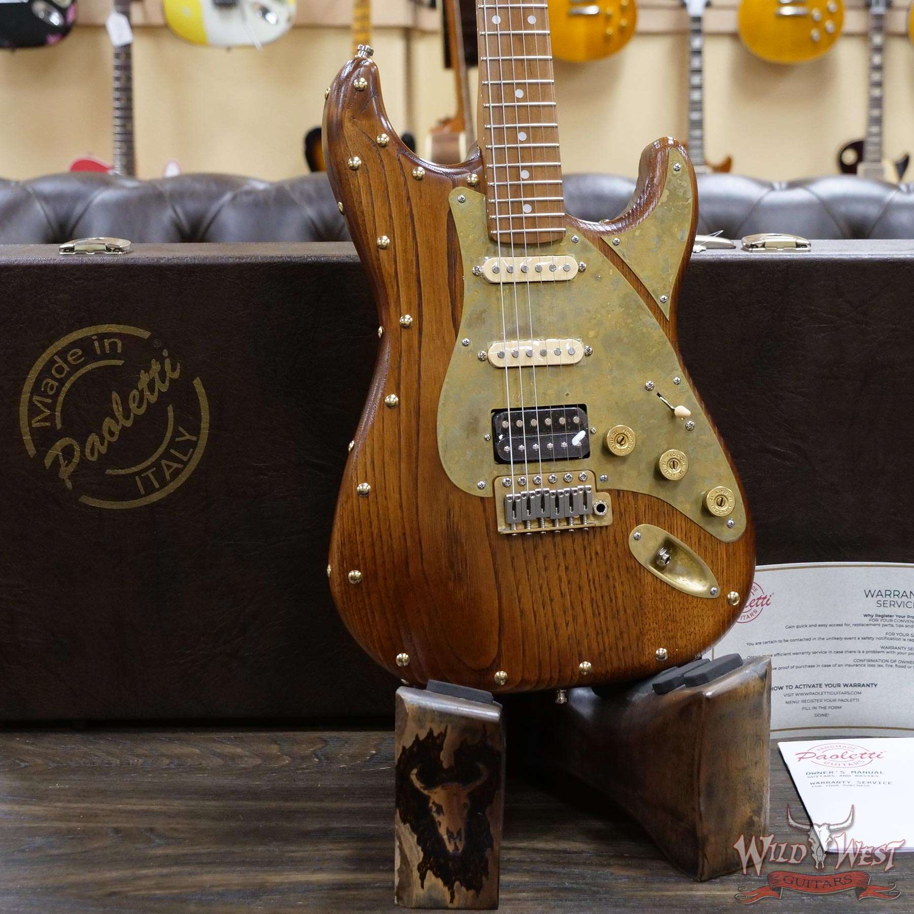 Here is a Paoletti® Stratopheric Wine Series which features their signature 130-150 year old reclaimed Chestnut body, Roasted Maple neck, Teak fretboard, Brass pick guard 2020 design, and Paoletti Strato 60s and Rock II humbucker.