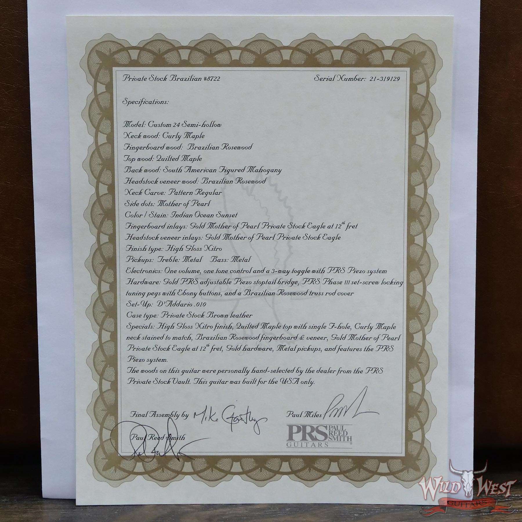 Paul Reed Smith PRS Private Stock # 8722 Quilt Top Custom 24 Piezo Semi-Hollow Stoptail Brazilian Rosewood Board Indian Ocean Sunset