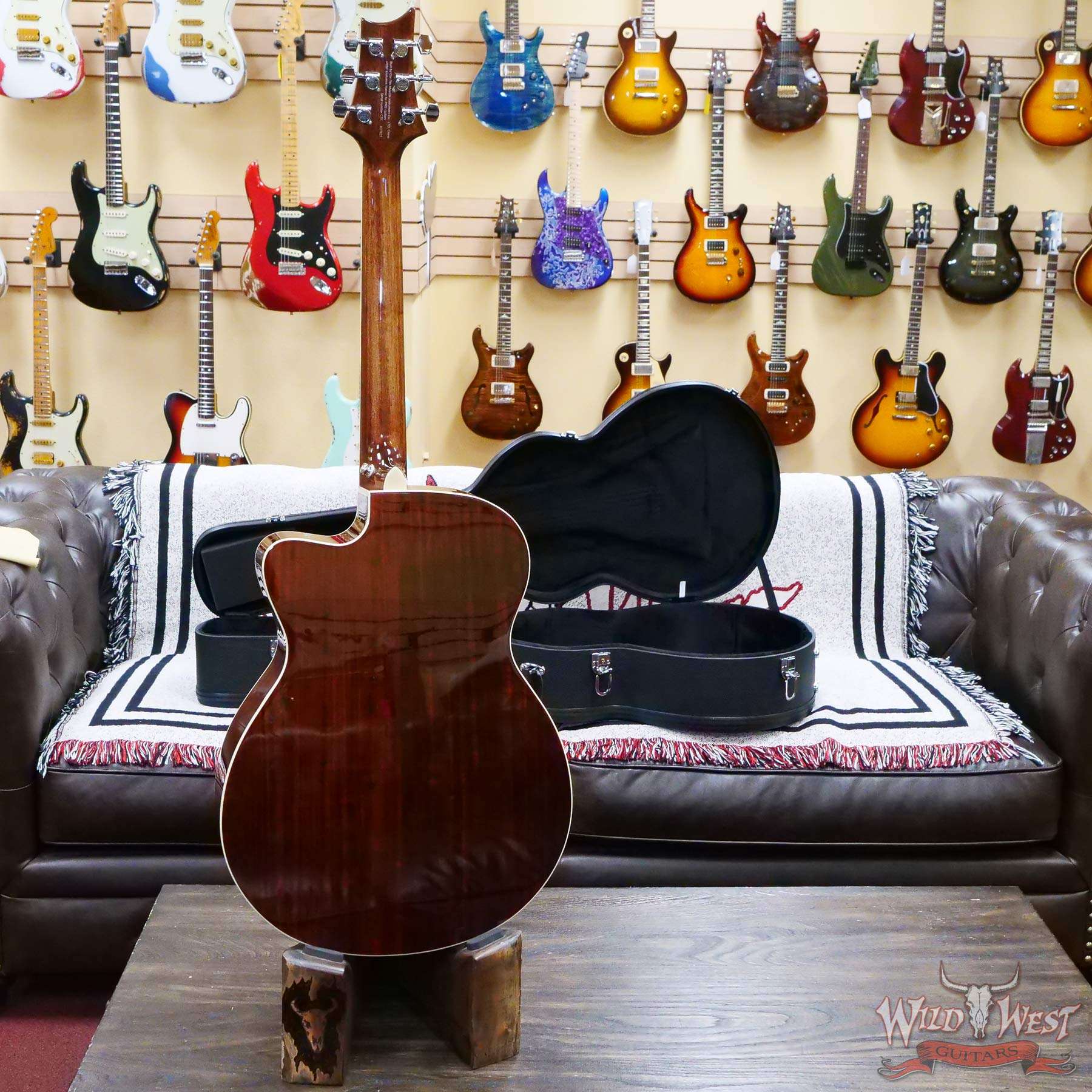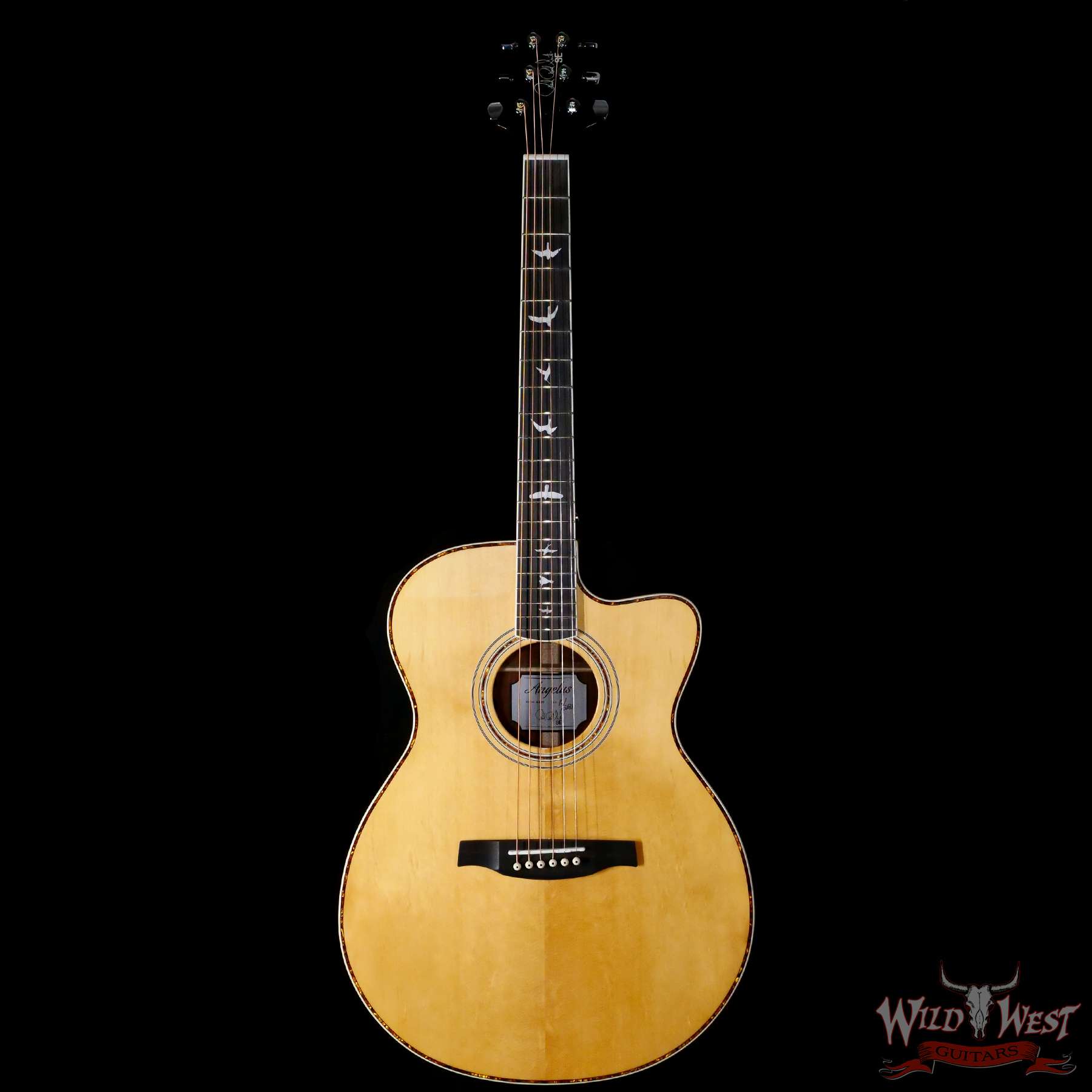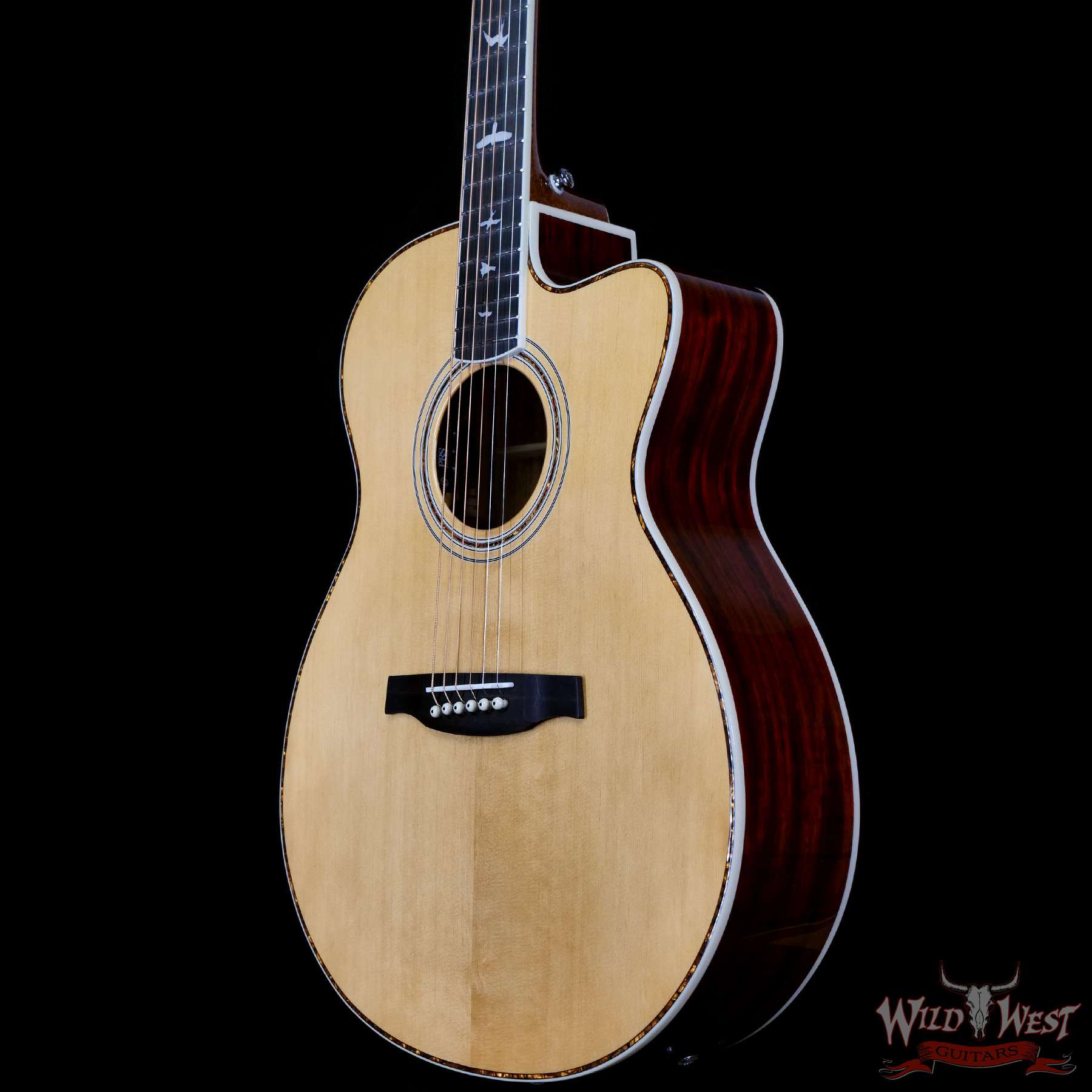 Additional high-quality features include a solid spruce top, ebony fretboard and bridge, bone nut and saddle, as well as PRS trademark bird inlays and headstock design. Ships with a high-quality hardshell case.