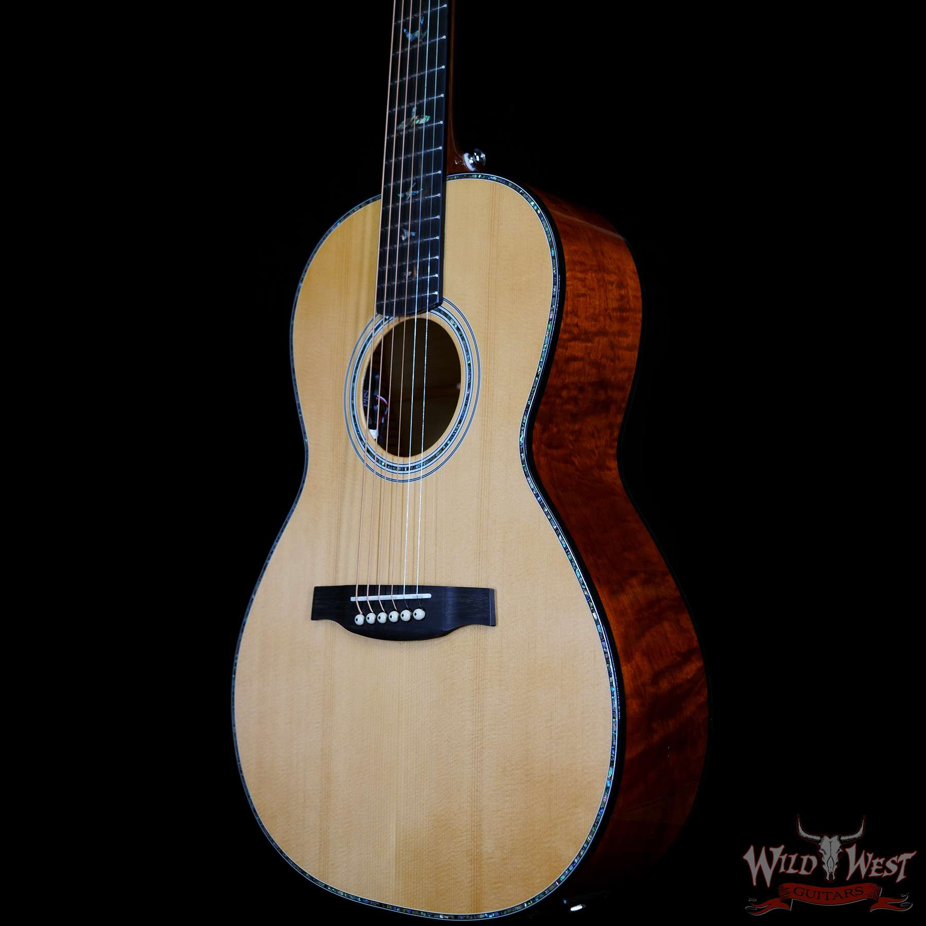 Additional high-quality features include Abalone purfling and bird inlays, ebony fretboard and bridge, and bone nut and saddle. Ships in a high-quality acoustic gig bag.