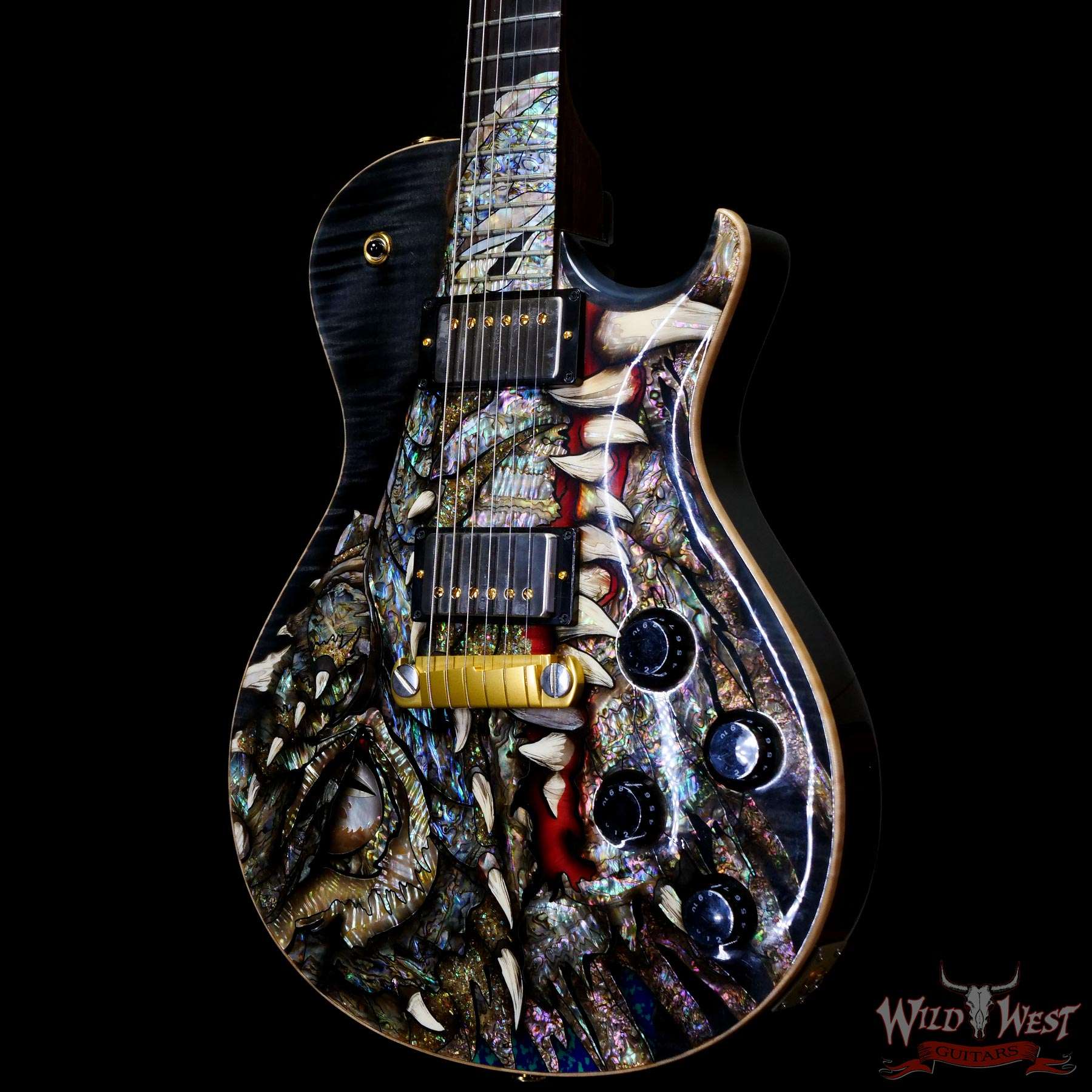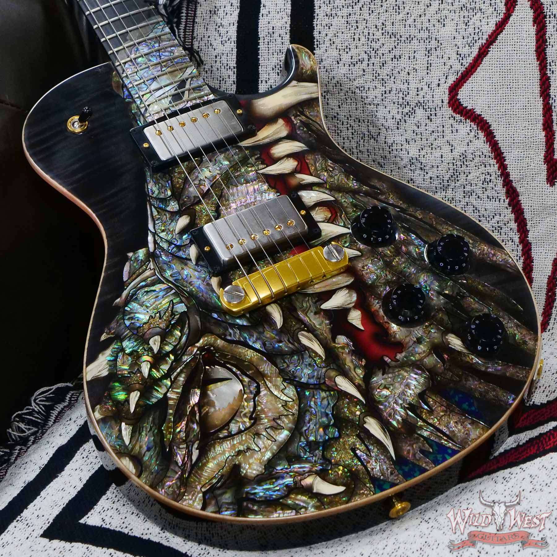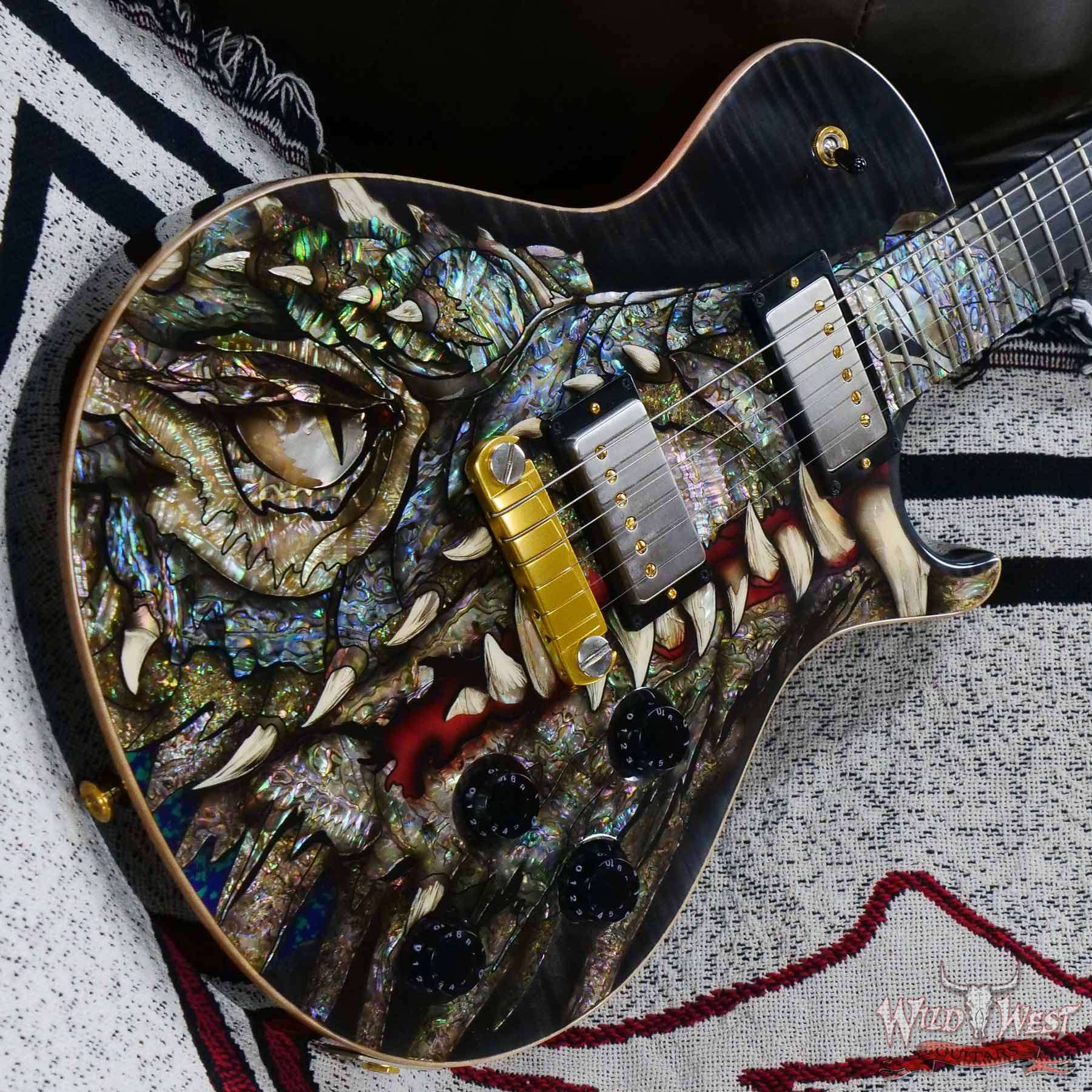 - Solid mahogany single-cutaway body, figured maple top, 3-D “dragons head” inlay