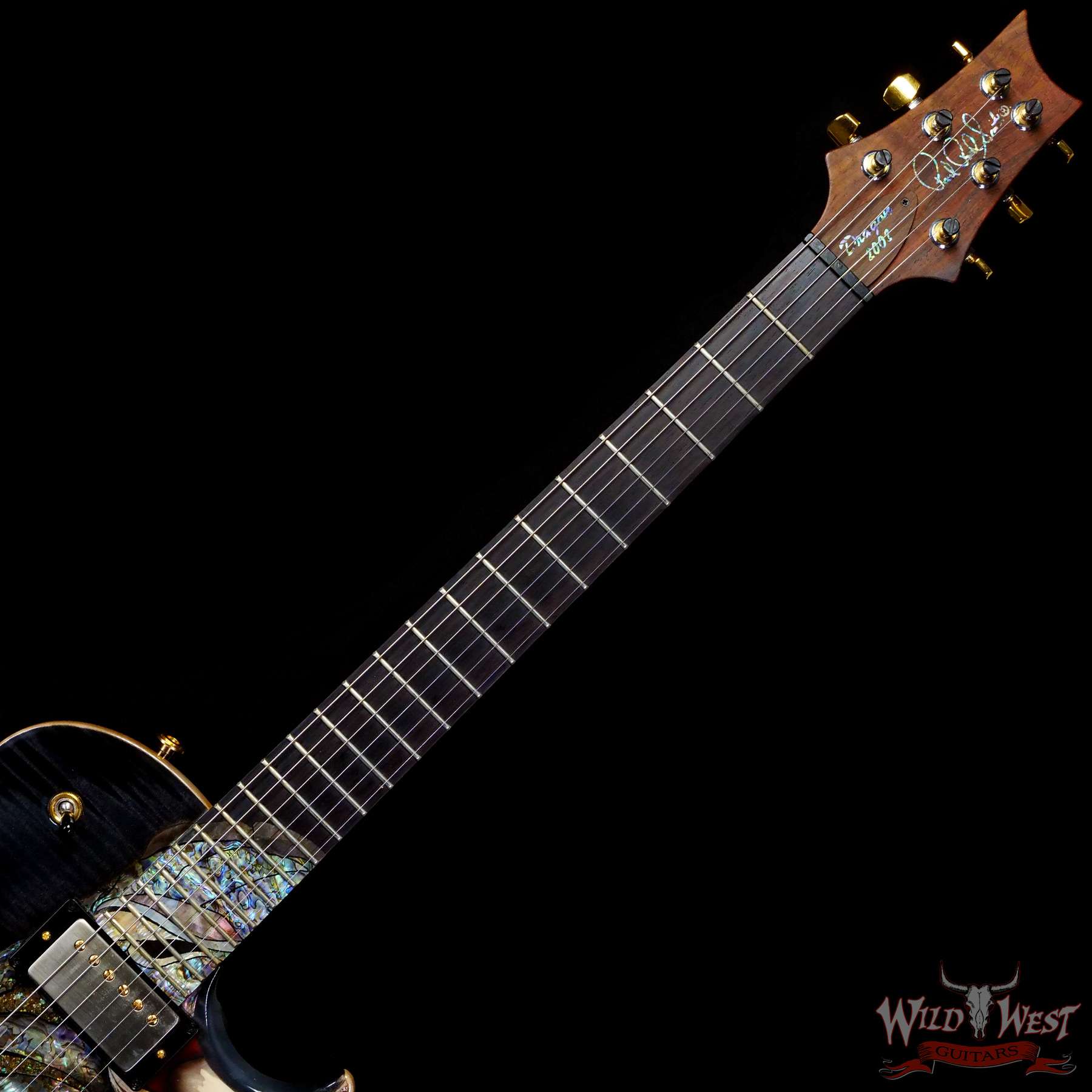 Before the Dragon 2002 was released, we had been prototyping and developing a single cut body shape. In 2002, for the first time, the Dragon line of guitars featured this new single cut body. With over 90% of the guitar’s top inlayed with material, the Dragon 2002 was our heaviest guitar to date. The design used for this guitar provided a close up view of a dragon – a fierce looking eye, snarling teeth, and a snout that extended onto the upper frets.