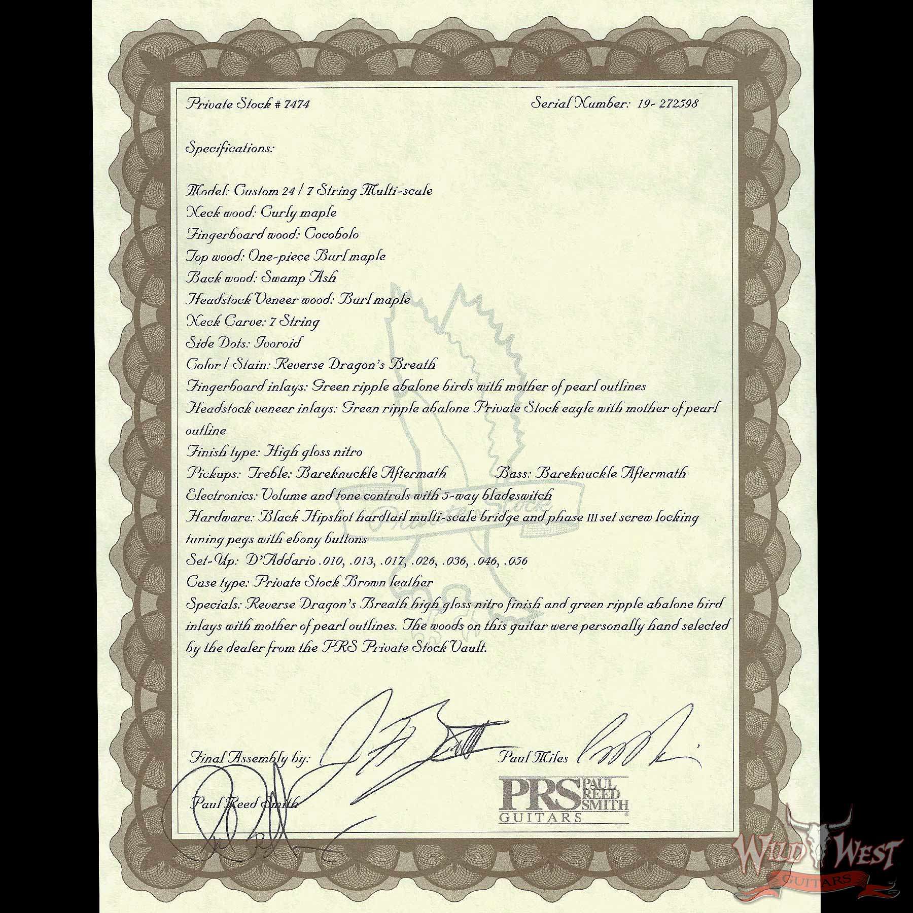 PRS Private Stock #7474 Custom 24 7-String Fanned Fret 1-Piece Burl Maple Top Cocobolo Fingerboard Dragon’s Breath
