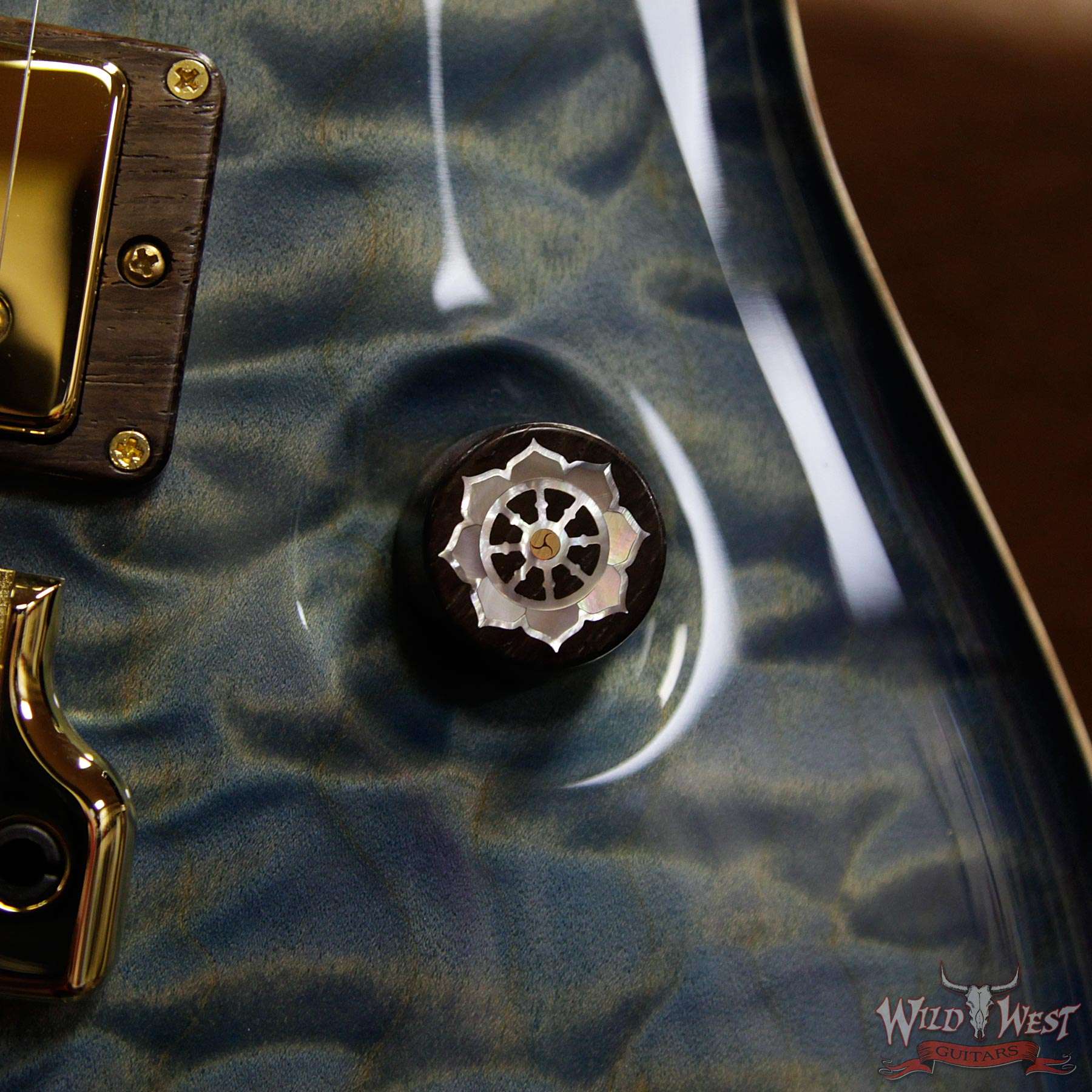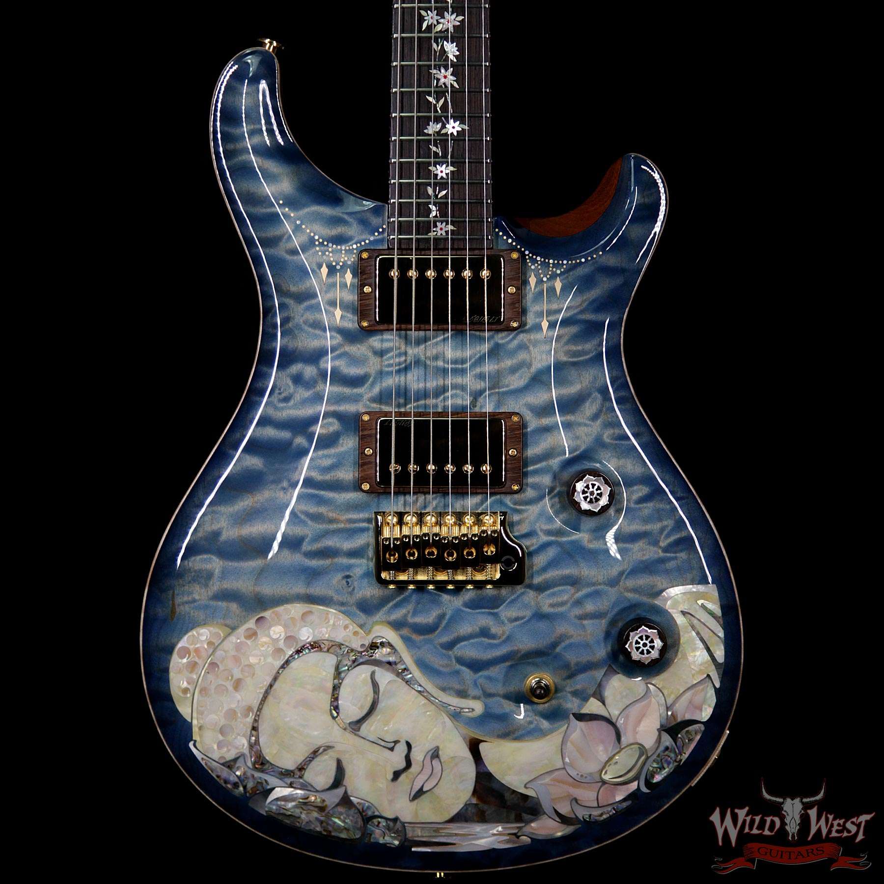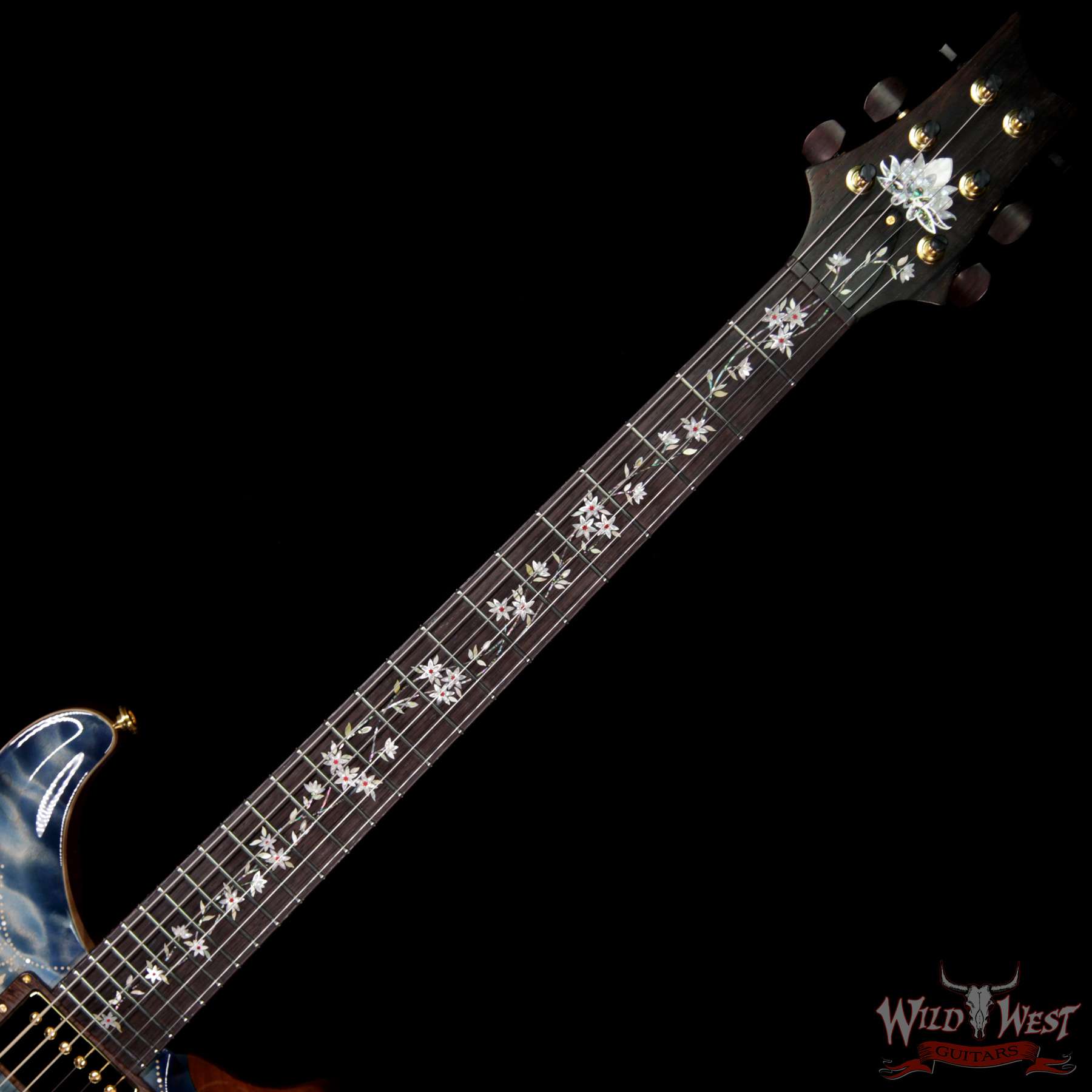 Faded Royal Blue Smoked Burst high gloss nitro finish, Modern Tree of Life along the fingerboard, headstock veneer and truss rod cover consisting of green heart abalone, sparkle MOP, dark red coral recon stone, solid white and god MOP, Lotus inlay on the headstock veneer consisting of green heart abalone, sparkle MOP and gold MOP with MOP outlines, MOP side dots as well as a”Guitar of the God’s” inlay on the top consisting of white, gold and black lip MOP, pink mussel, pink select abalone, agoya, awabi and 14 karal gold. The woods on this guitar were personlly hand selected by the Wild West Guitars from the PRS Private Stock Vault.