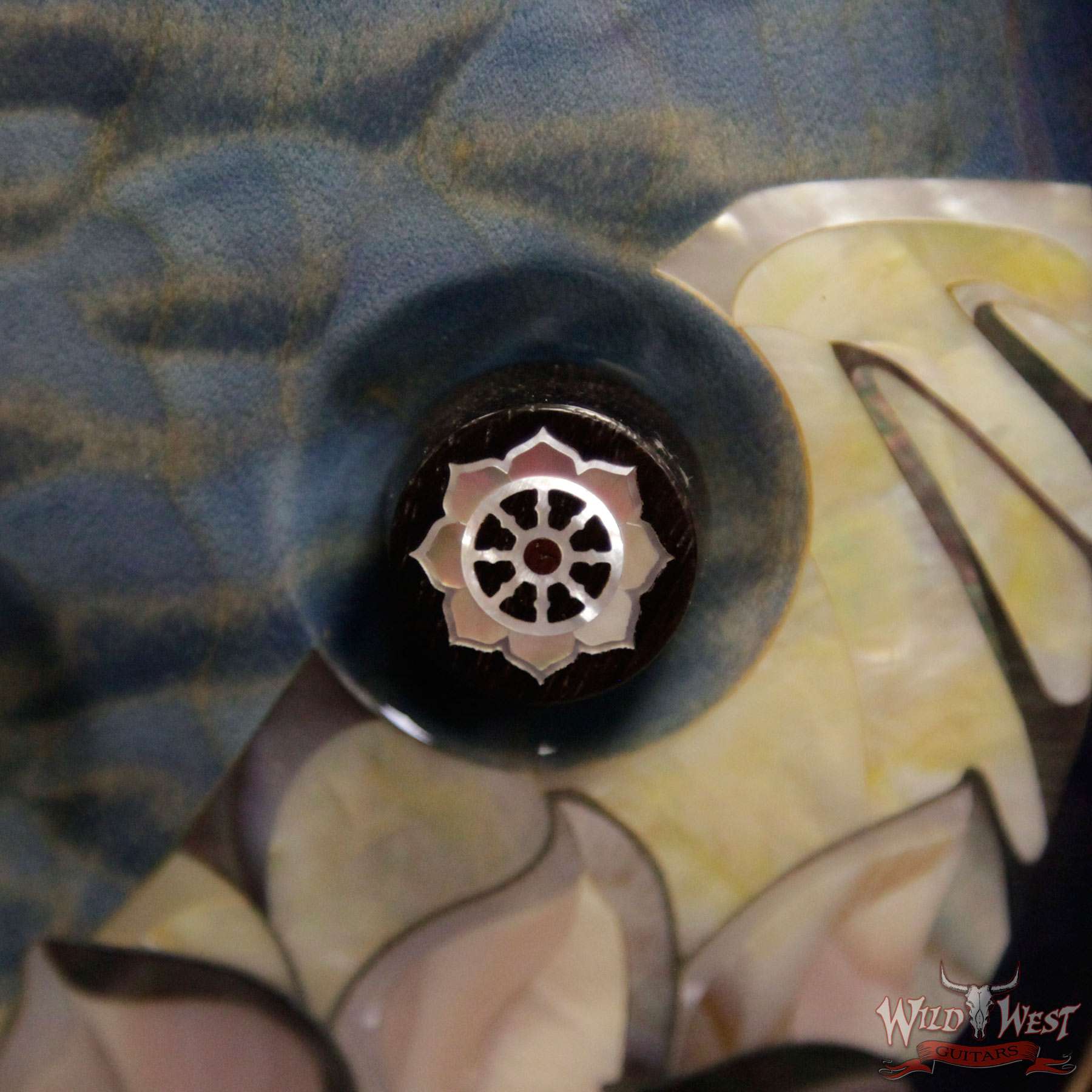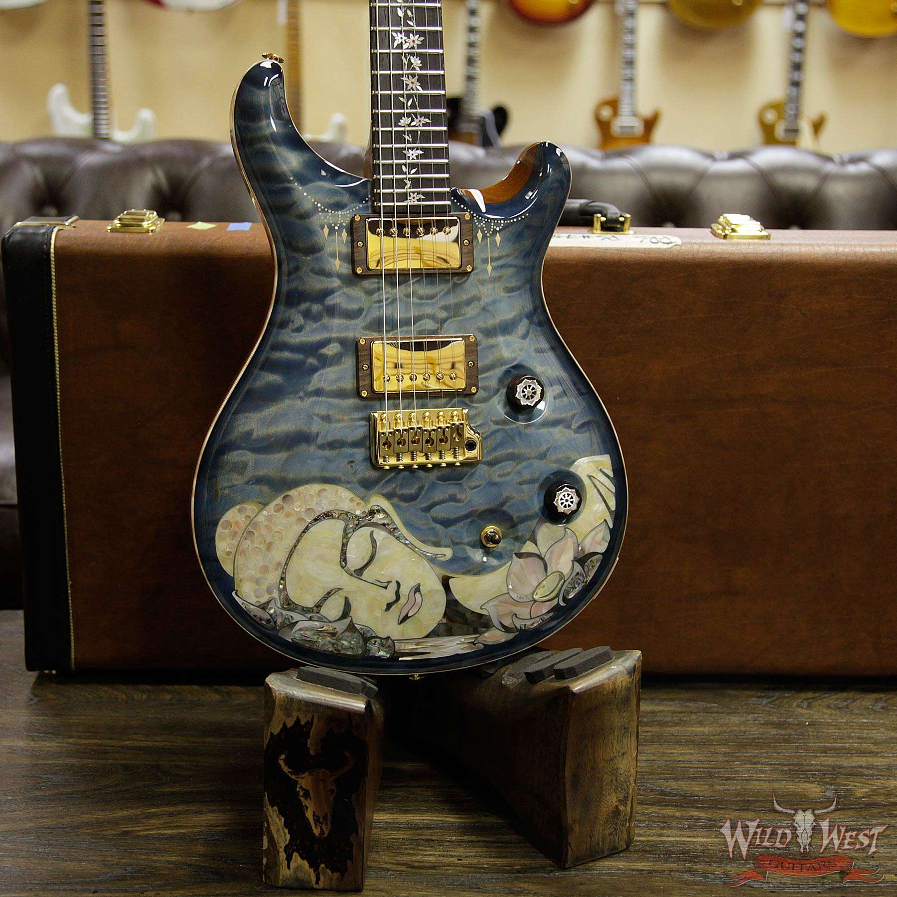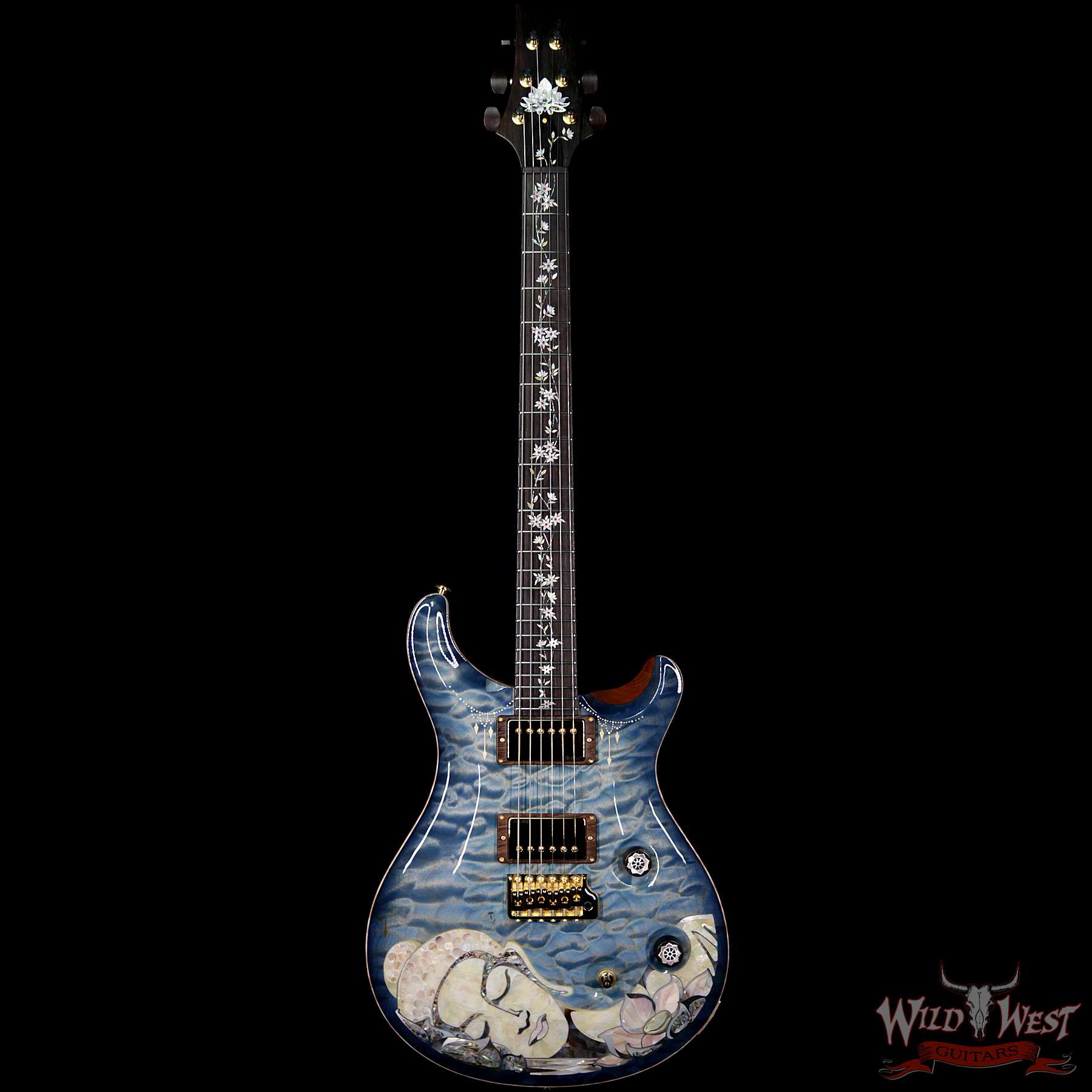 Faded Royal Blue Smoked Burst high gloss nitro finish, Modern Tree of Life along the fingerboard, headstock veneer and truss rod cover consisting of green heart abalone, sparkle MOP, dark red coral recon stone, solid white and god MOP, Lotus inlay on the headstock veneer consisting of green heart abalone, sparkle MOP and gold MOP with MOP outlines, MOP side dots as well as a”Guitar of the God’s” inlay on the top consisting of white, gold and black lip MOP, pink mussel, pink select abalone, agoya, awabi and 14 karal gold. The woods on this guitar were personlly hand selected by the Wild West Guitars from the PRS Private Stock Vault.