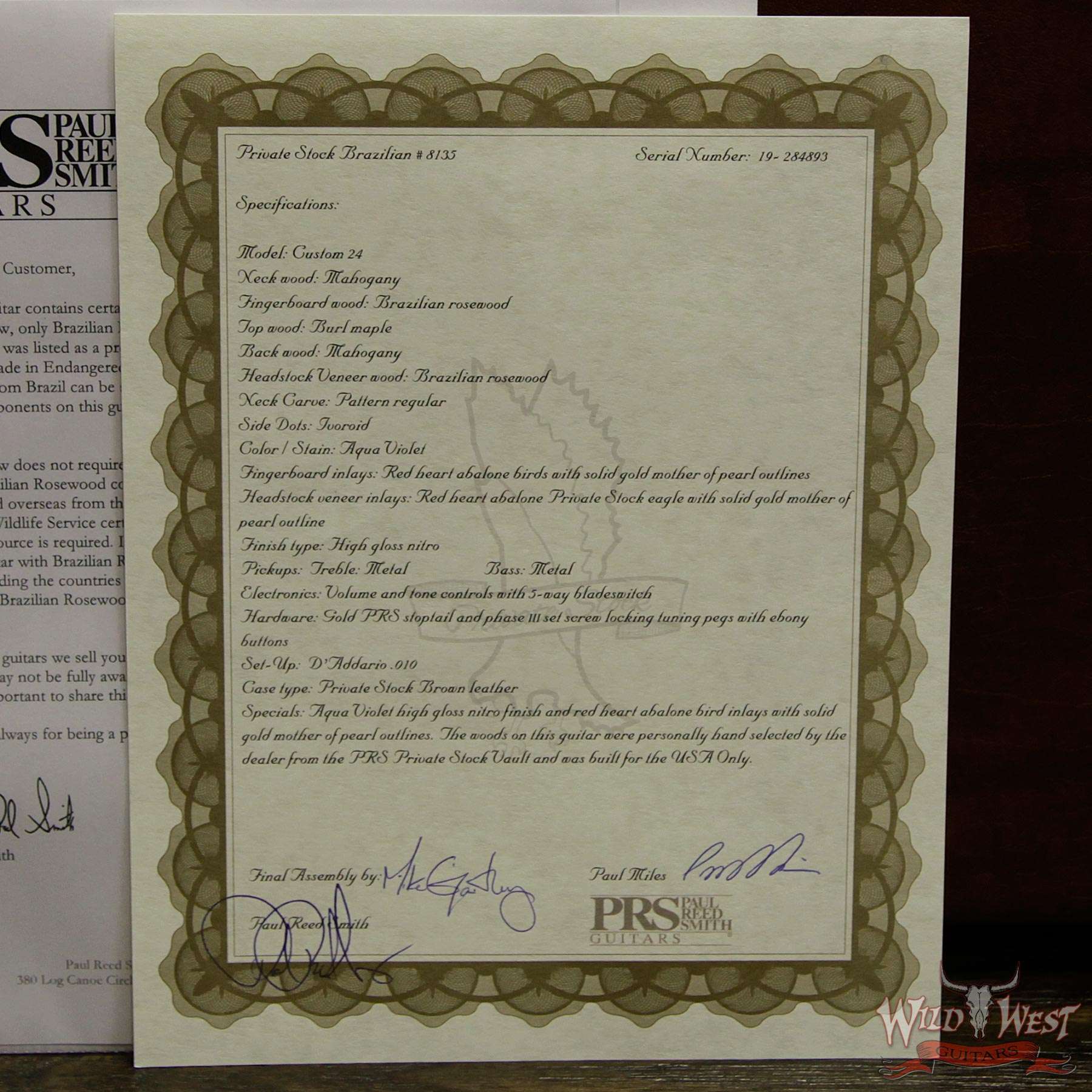 PRS Private Stock #8135 Custom 24 Stoptail Burl Maple Top Brazilian Rosewood Board Aqua Violet