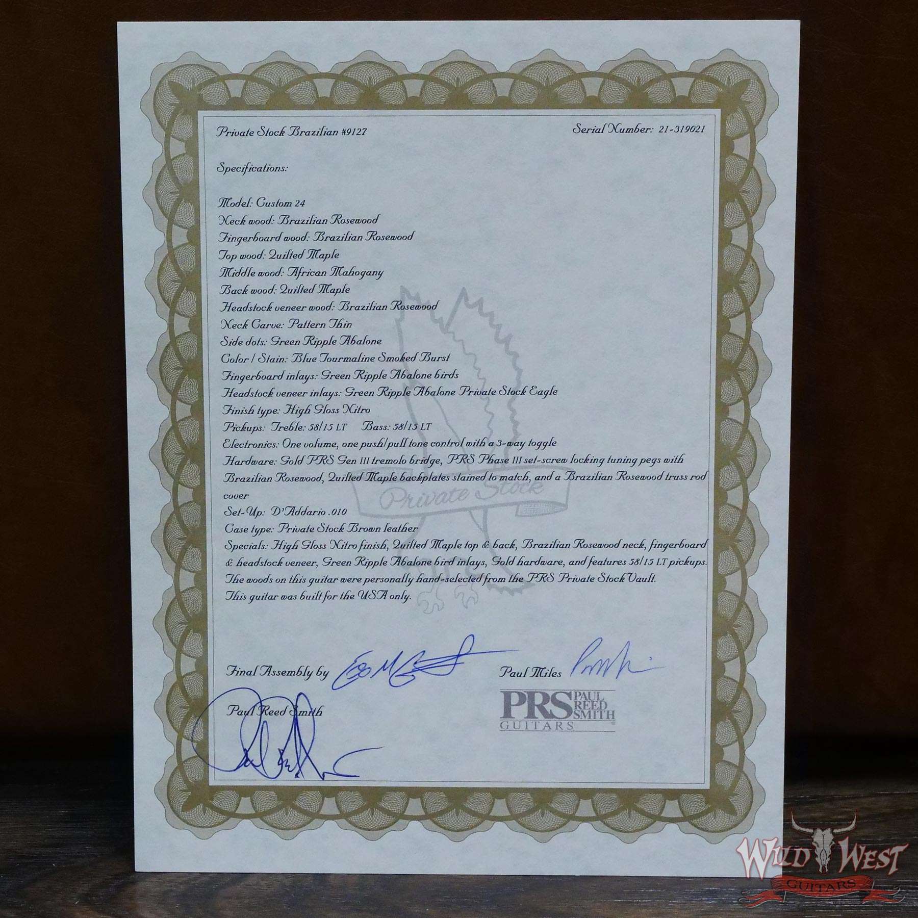 PRS Private Stock #9127 Custom 24 1-Piece Quilt Maple Top & Back Brazilian Rosewood Neck & Board Blue Tourmaline Smoked Burst