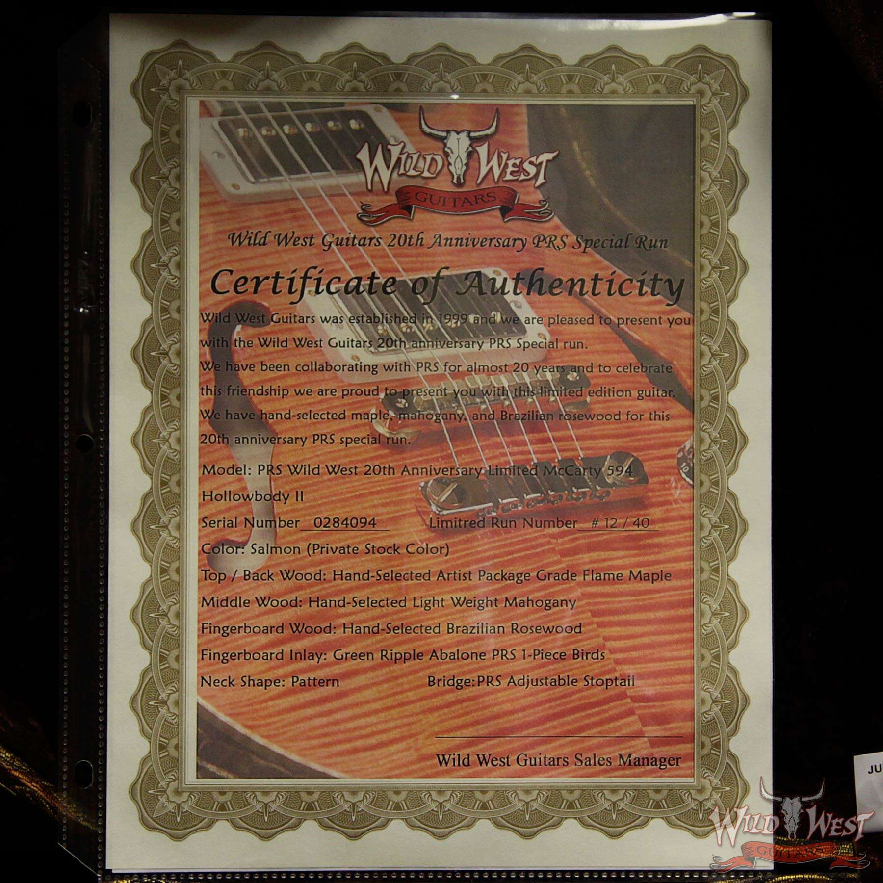 Wild West Guitars was established in 1999 and we are pleased to present you with the Wild West Guitars 20th Anniversary PRS Special Run. We have been collaborating with PRS for almost 20 years and to celebrate this friendship we are proud to present you with this limited edition guitar. We have hand selected maple, mahogany, and Brazilian rosewood for this 20th anniversary Wood Library Artist Package McCarty 594 Hollowbody II limited to 10 in Salmon(Private Stock Color). Contact us for our Special Anniversary promotions.