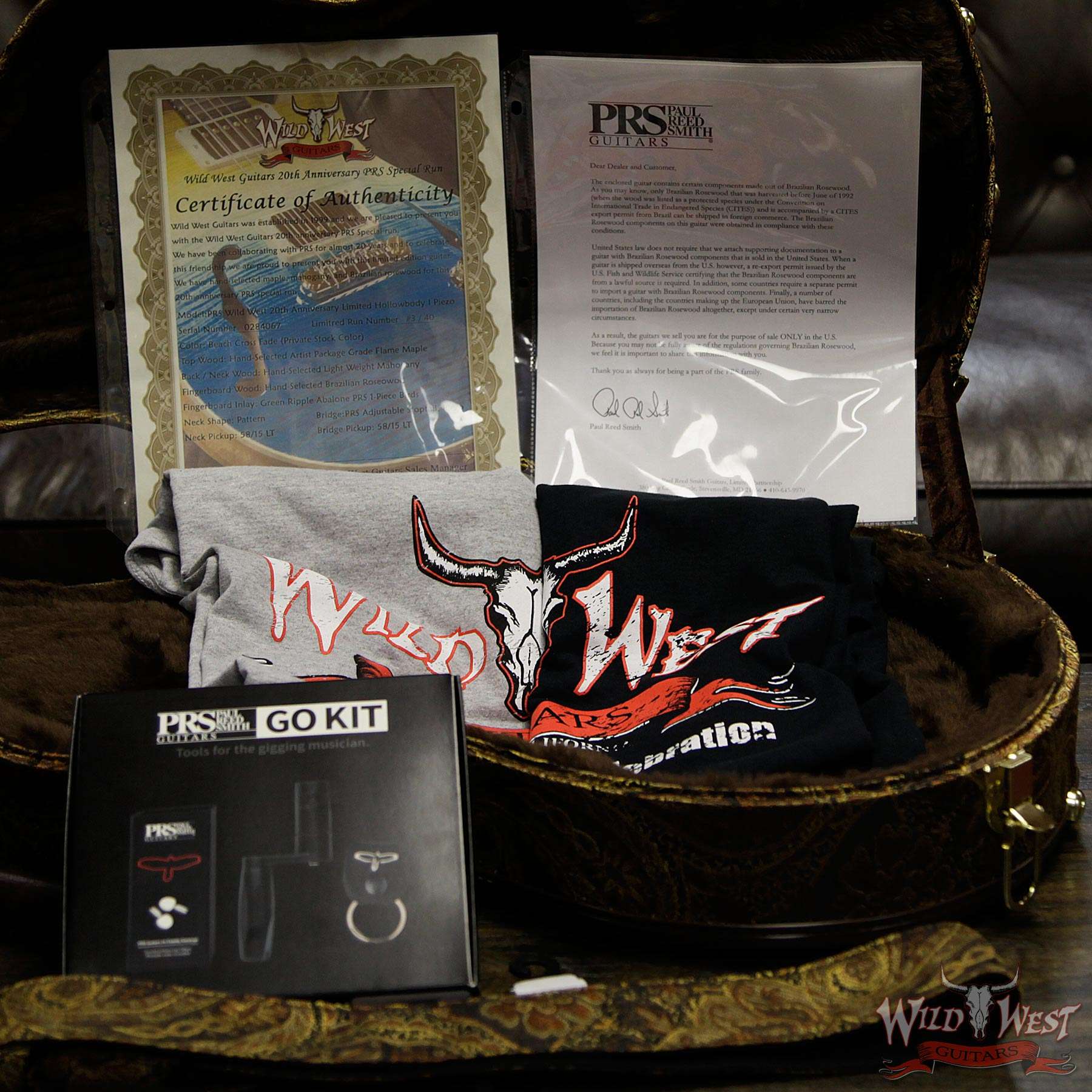 Wild West Guitars was established in 1999 and we are pleased to present you with the Wild West Guitars 20th Anniversary PRS Special Run. We have been collaborating with PRS for almost 20 years and to celebrate this friendship we are proud to present you with this limited edition guitar. We have hand selected maple, mahogany, and Brazilian rosewood for this 20th anniversary Wood Library Artist Package Hollowbody I limited to 10 in beach cross fade. Contact us for our Special Anniversary promotions.
