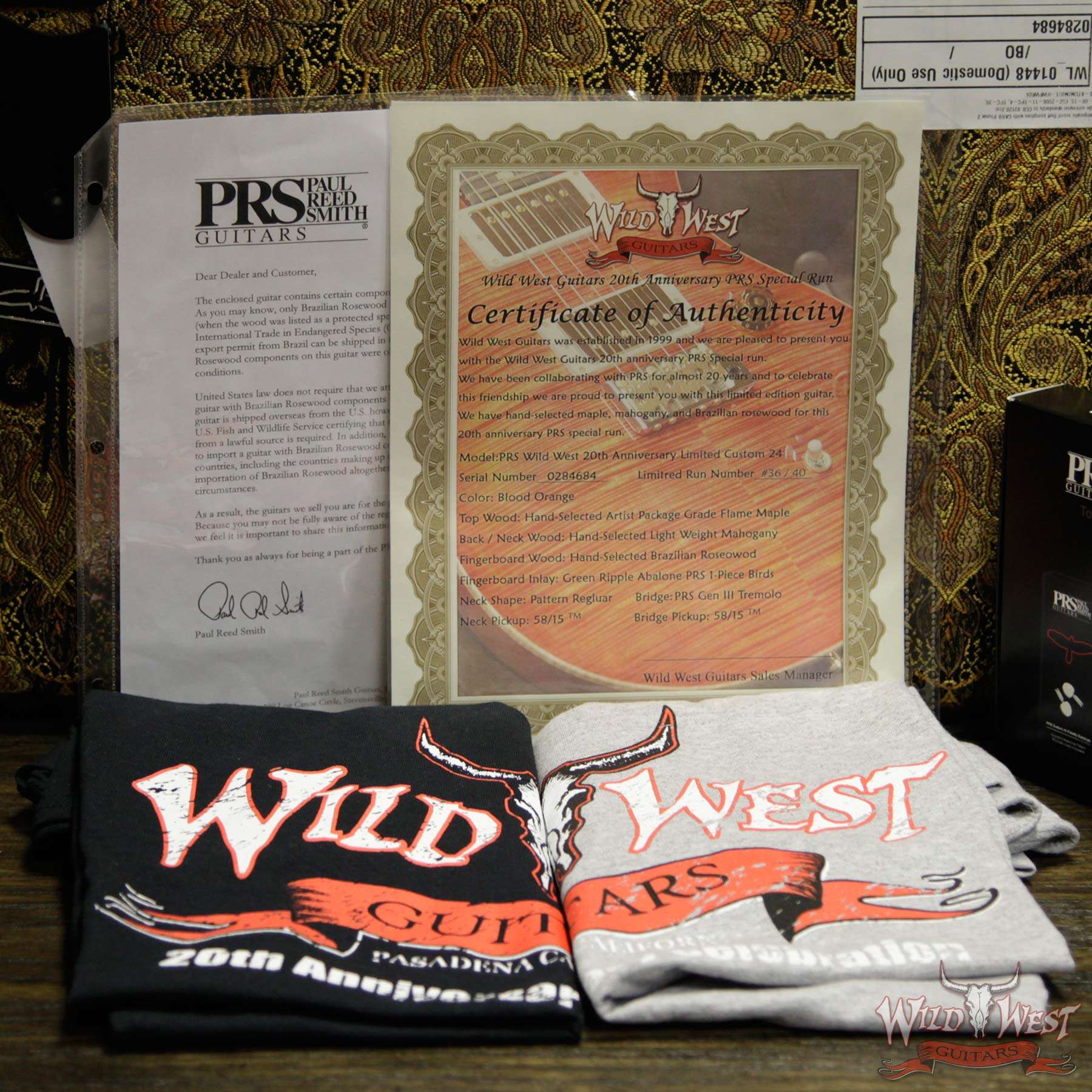 PRS Wild West Guitars 20th Anniversary Limited Run # 36 of 40 Wood Library Artist Package Custom 24 Brazilian Rosewood Fingerboard Blood Orange