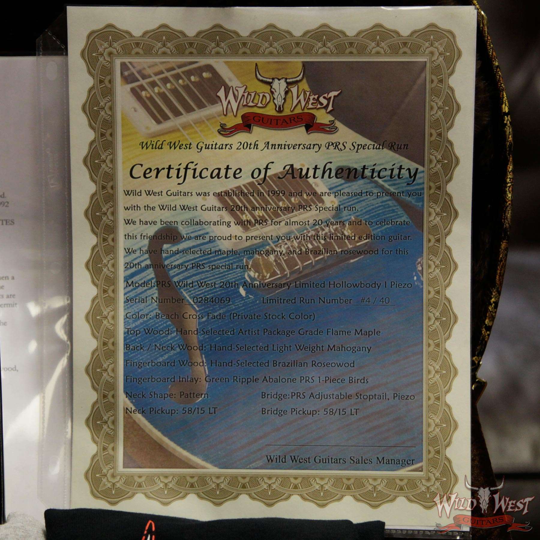 Wild West Guitars was established in 1999 and we are pleased to present you with the Wild West Guitars 20th Anniversary PRS Special Run Pack. We have been collaborating with PRS for almost 20 years and to celebrate this friendship we are proud to present you with this limited edition guitar. We have hand selected maple, mahogany, and Brazilian rosewood for this 20th anniversary Hollow body I Wood Library Artist model limited to 10 in beach cross fade. This anniversary pack includes: