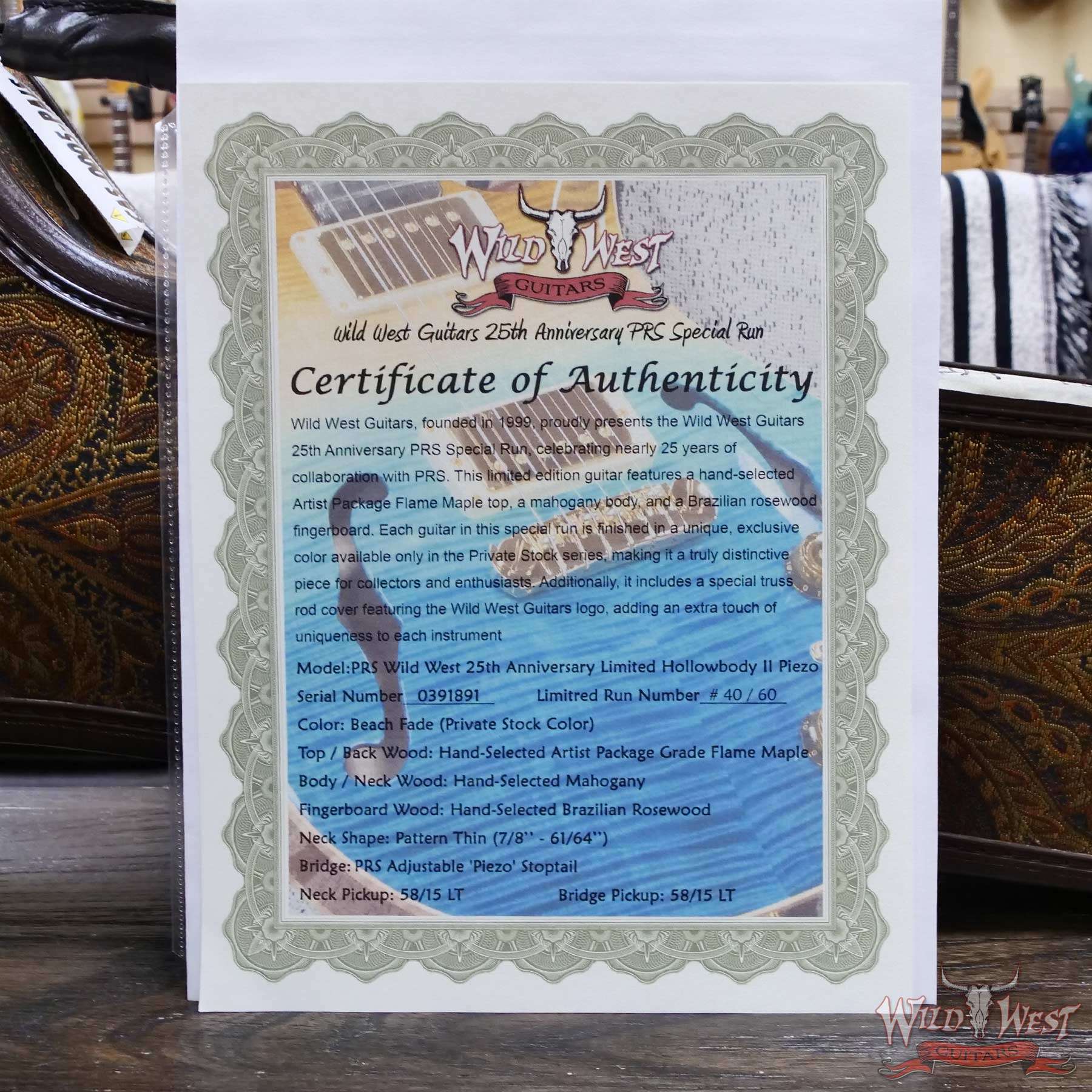 Wild West Guitars, founded in 1999, proudly presents the Wild West Guitars 25th Anniversary PRS Special Run, celebrating nearly 25 years of collaboration with PRS. This limited edition guitar features a hand-selected Artist Package Flame Maple top and back, a mahogany body and neck, and a Brazilian rosewood fingerboard. Each guitar in this special run is finished in a unique, exclusive color available only in the Private Stock series, making it a truly distinctive piece for collectors and enthusiasts. Additionally, it includes a special truss rod cover featuring the Wild West Guitars logo, adding an extra touch of uniqueness to each instrument.