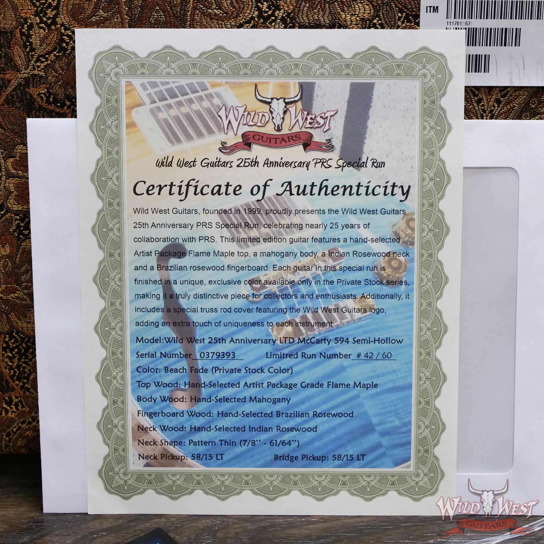 PRS Wild West Guitars 25th Anniversary Limited Run Wood Library Artist Package McCarty 594 Semi-Hollow Beach Fade (Private Stock Color) 6.90 LBS (US Only / No International Shipping)