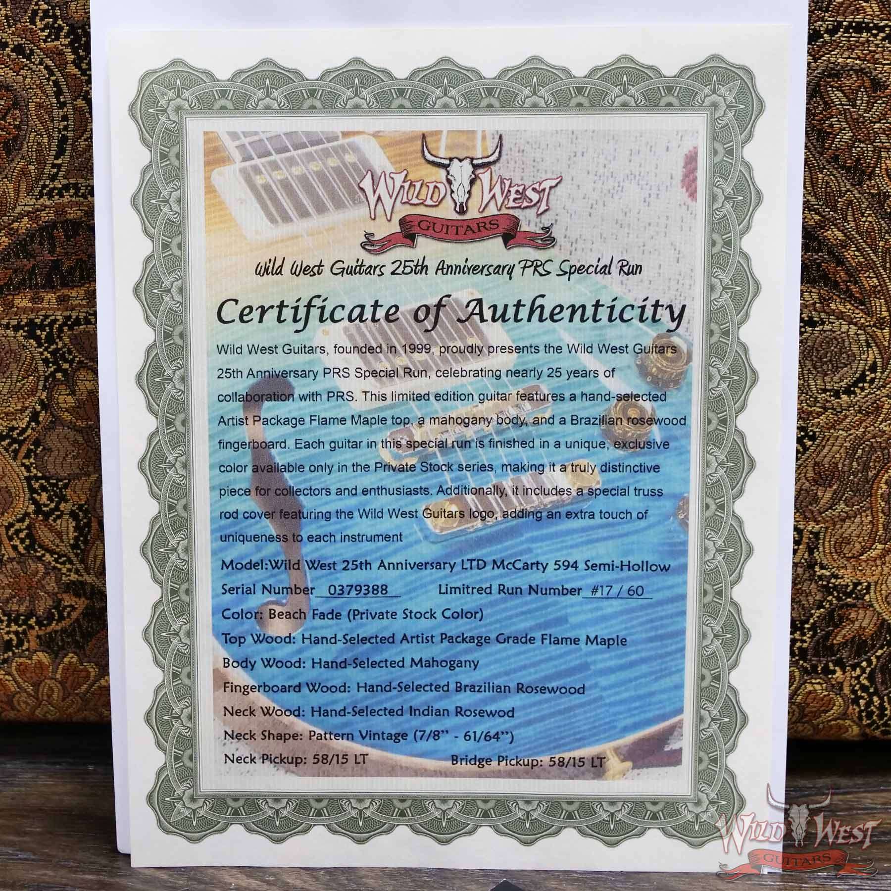 PRS Wild West Guitars 25th Anniversary Limited Run Wood Library Artist Package McCarty 594 Semi-Hollow Beach Fade (Private Stock Color) 7.20 LBS (US Only / No International Shipping)