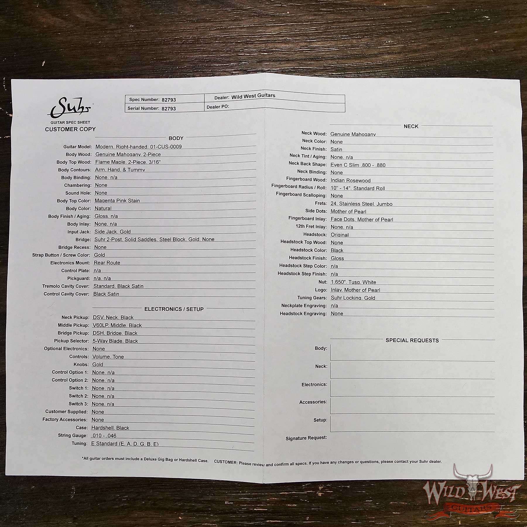 Suhr Custom Modern HSH Flame Maple Top Genuine Mahogany Body & Neck Indian Rosewood Fingerboard Magenta Pink 7.40 LBS