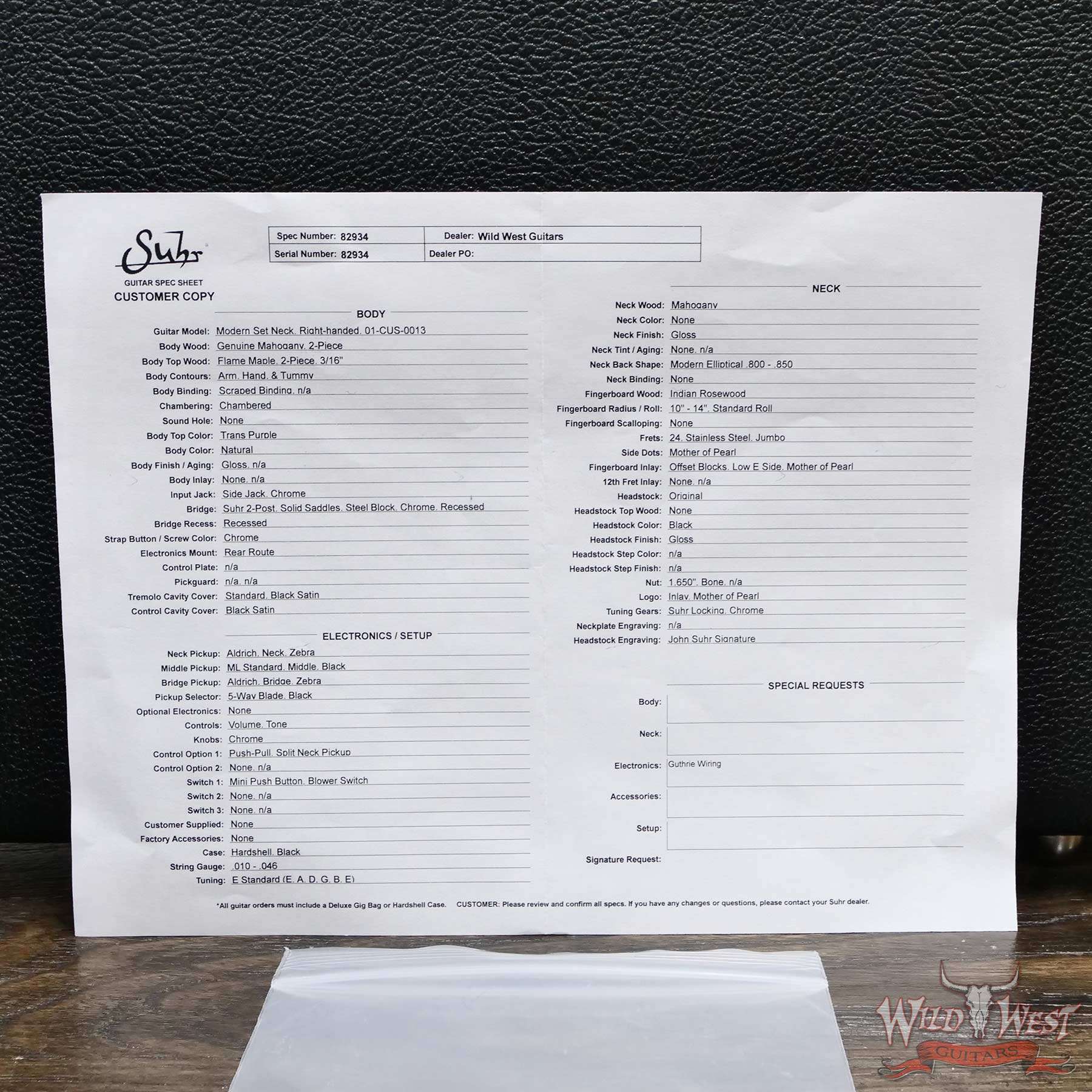 Suhr Custom Set Neck Modern HSH Flame Maple Top Mahogany Body & Neck Blower Switch 24 Stainless Steel Jumbo Frets Trans Purple 6.95 LBS