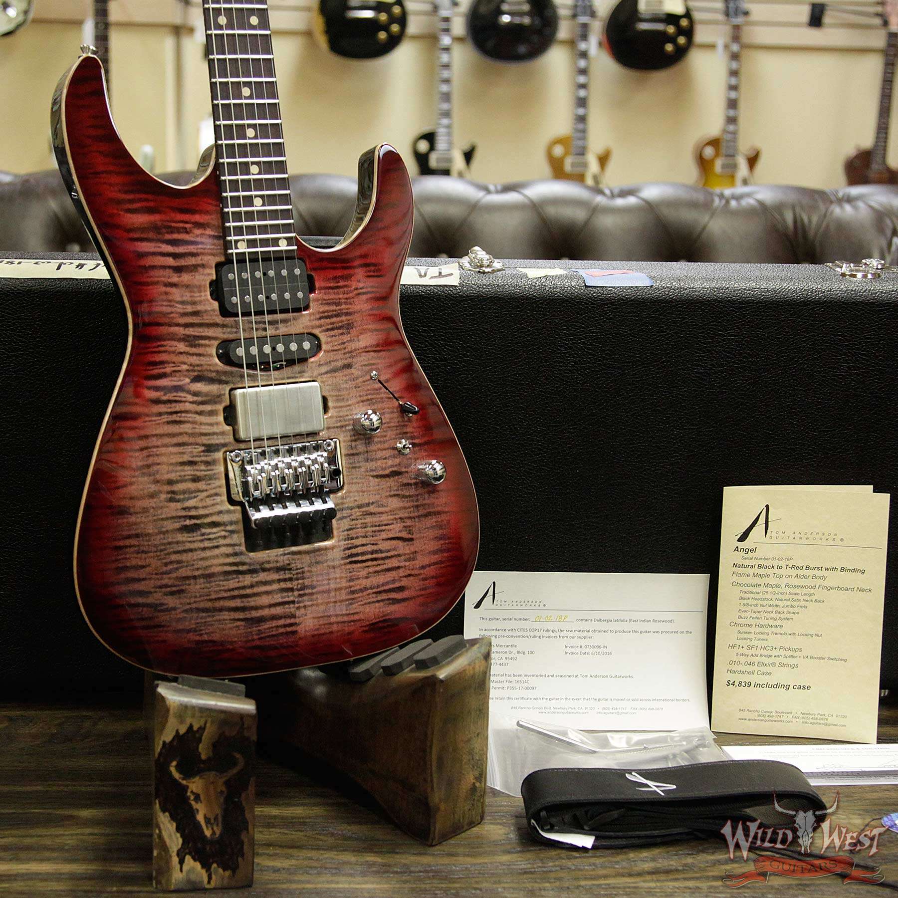 | Model | Tom Anderson Angel HSH Floyd Flame Top Chocolate Maple Neck Rosewood Board Natural Black to T-Red Burst with Binding |